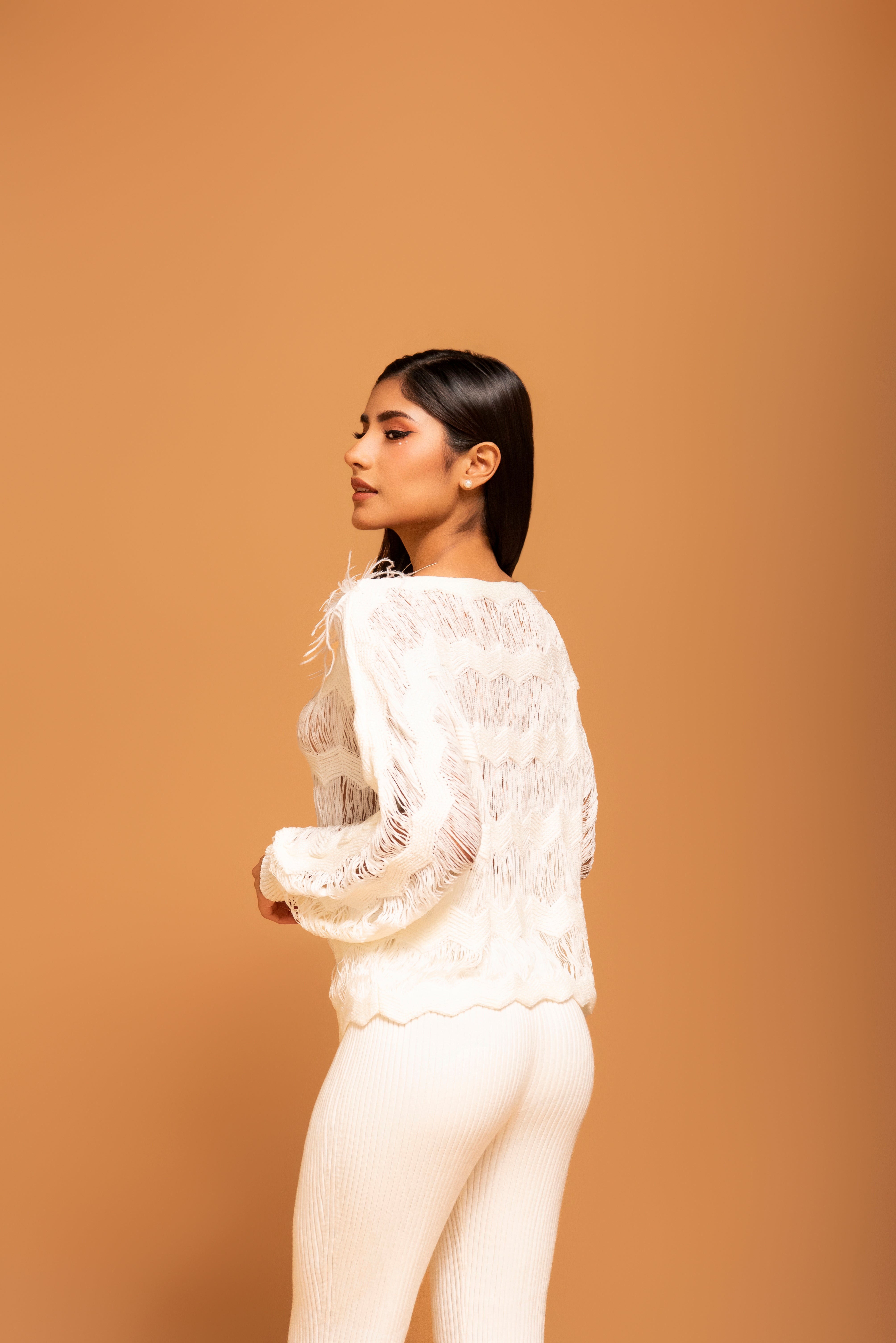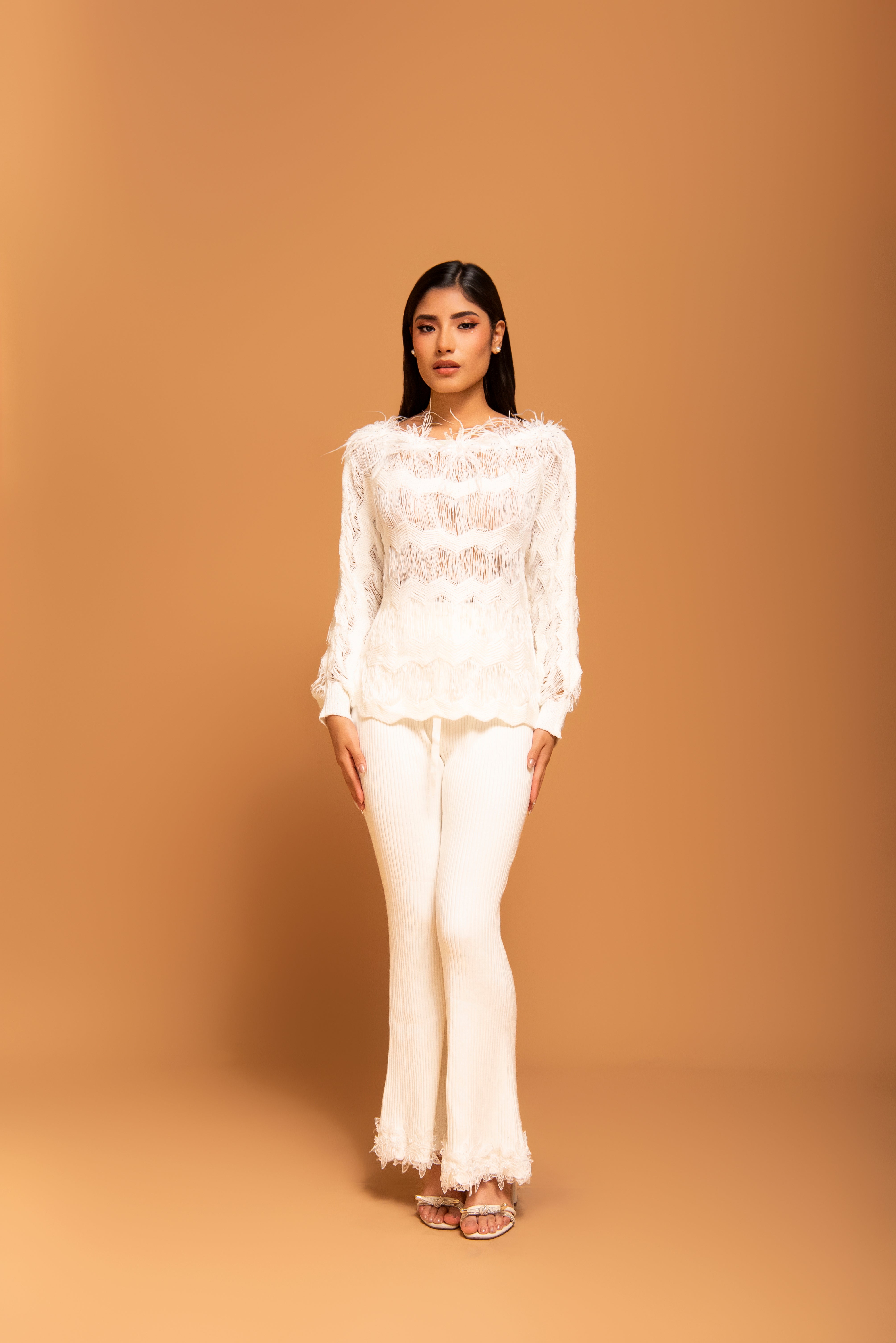 Una pieza de declaración que redefine el concepto de punto. Esta chompa blanca destaca por su intrincado tejido calado en patrón de ondas y su acabado texturizado con delicados hilos de aspecto plumoso. El cuello redondo y las mangas largas crean una silueta clásica que contrasta con su textura vanguardista y lujosa.