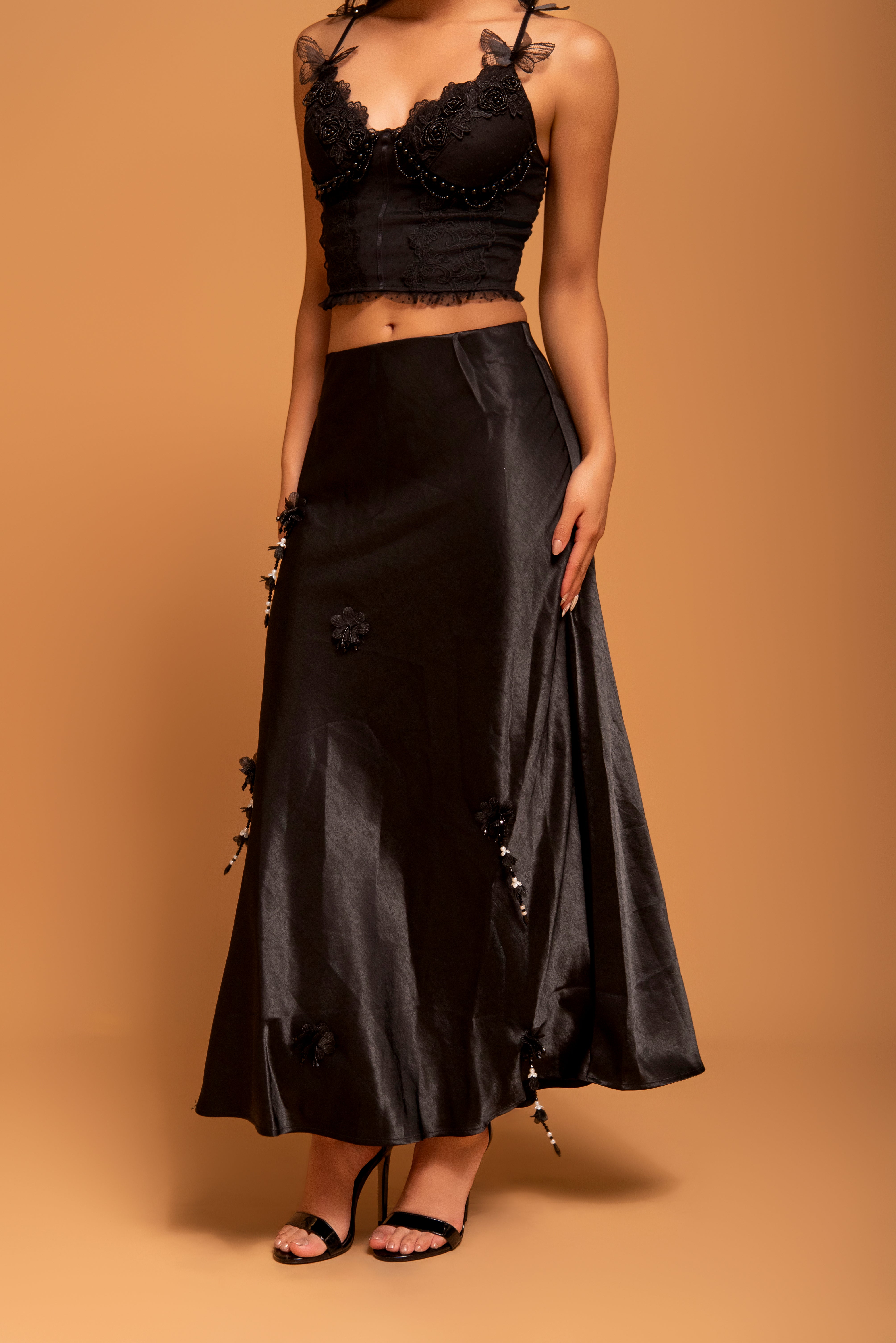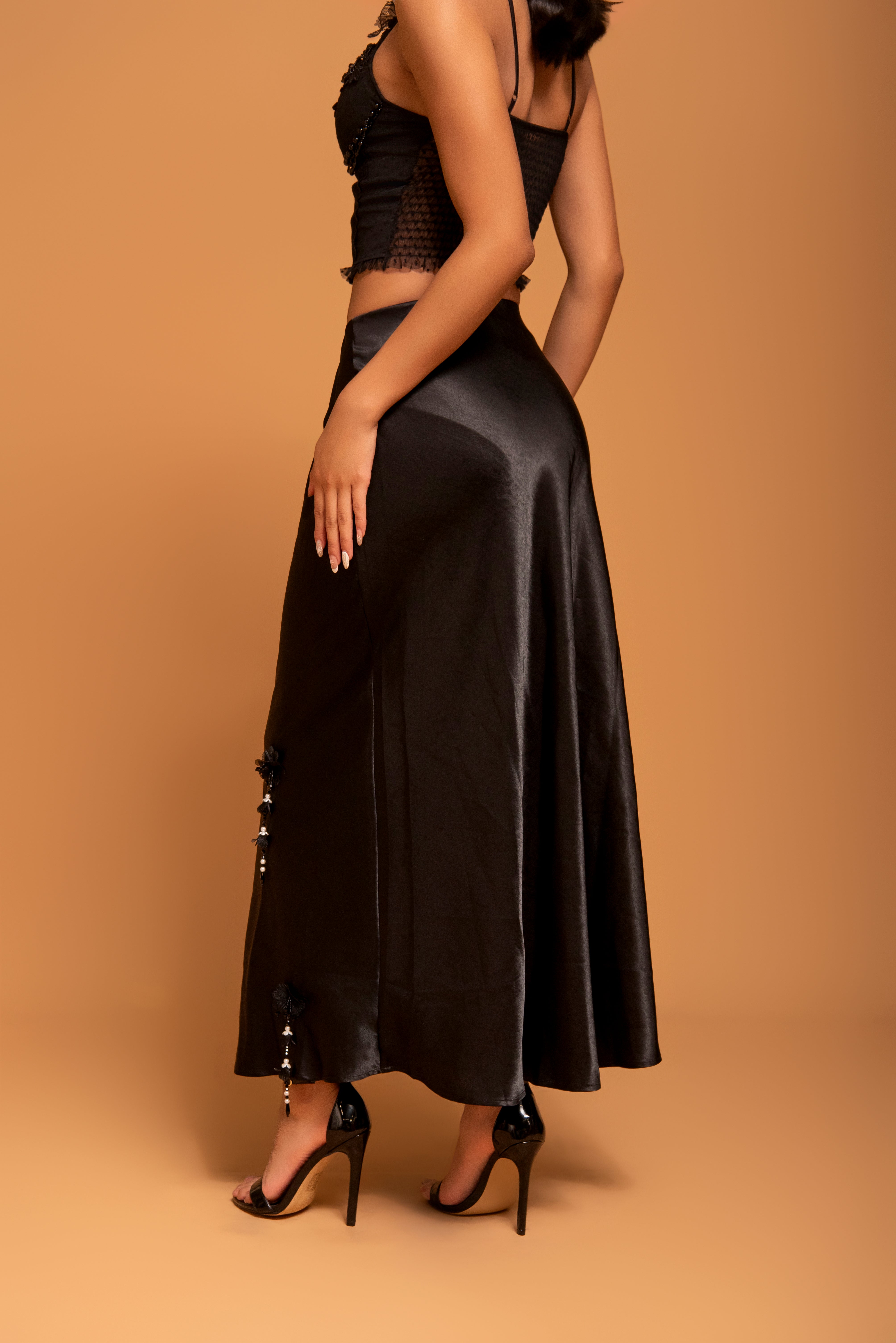 Una pieza que personifica el lujo moderno. Esta falda larga de corte evasé está confeccionada en un satén de brillo sutil y caída fluida que se adapta con gracia al movimiento. Destaca por sus delicados apliques de flores en 3D y detalles de pedrería que caen en cascada de forma asimétrica, aportando un toque artesanal y exclusivo a la silueta.