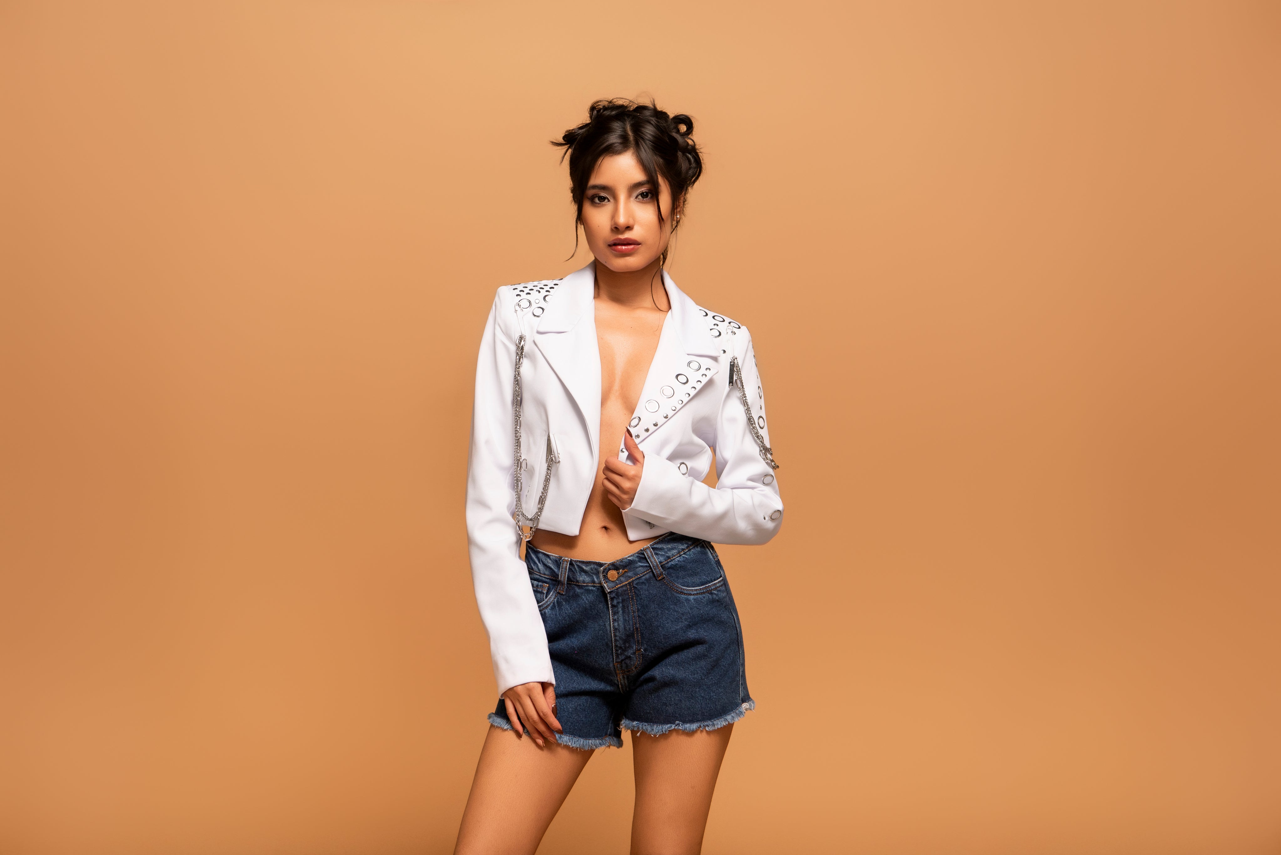 Jacket blazer estilo crop color blanco con detalles de cadenas plateadas en el hombro y detalle de aros metálicos en los hombros y espalda.