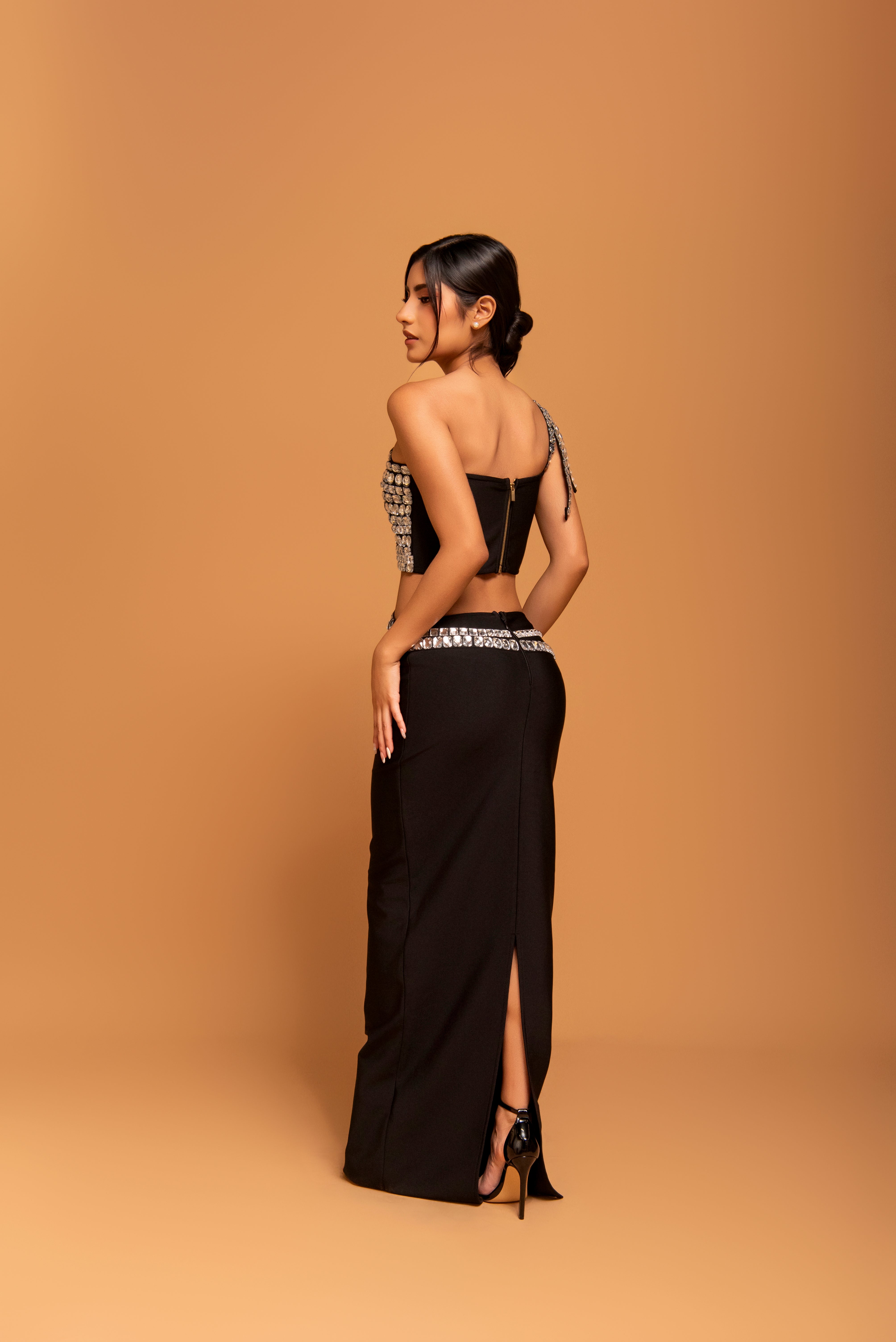 Este set de dos piezas redefine el lujo nocturno, combinando una falda larga de silueta sirena en negro profundo con un deslumbrante top artesanal. El top asimétrico está completamente recubierto de cristales de diversos cortes que capturan la luz desde cualquier ángulo, creando un efecto de armadura enjoyada. Las tiras de cristales que envuelven la cintura y el hombro aportan un dinamismo arquitectónico que estiliza la figura y garantiza un impacto visual absoluto.