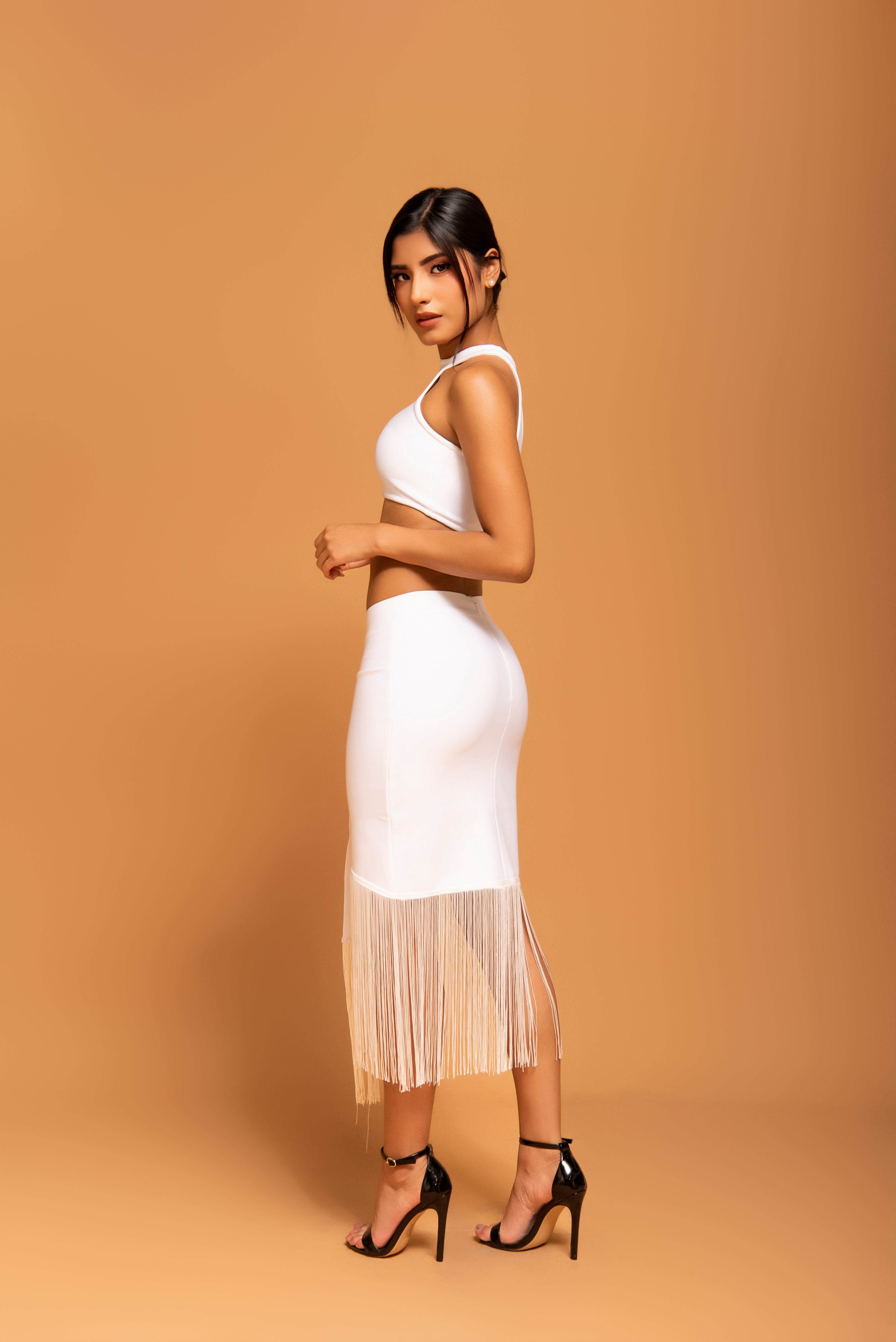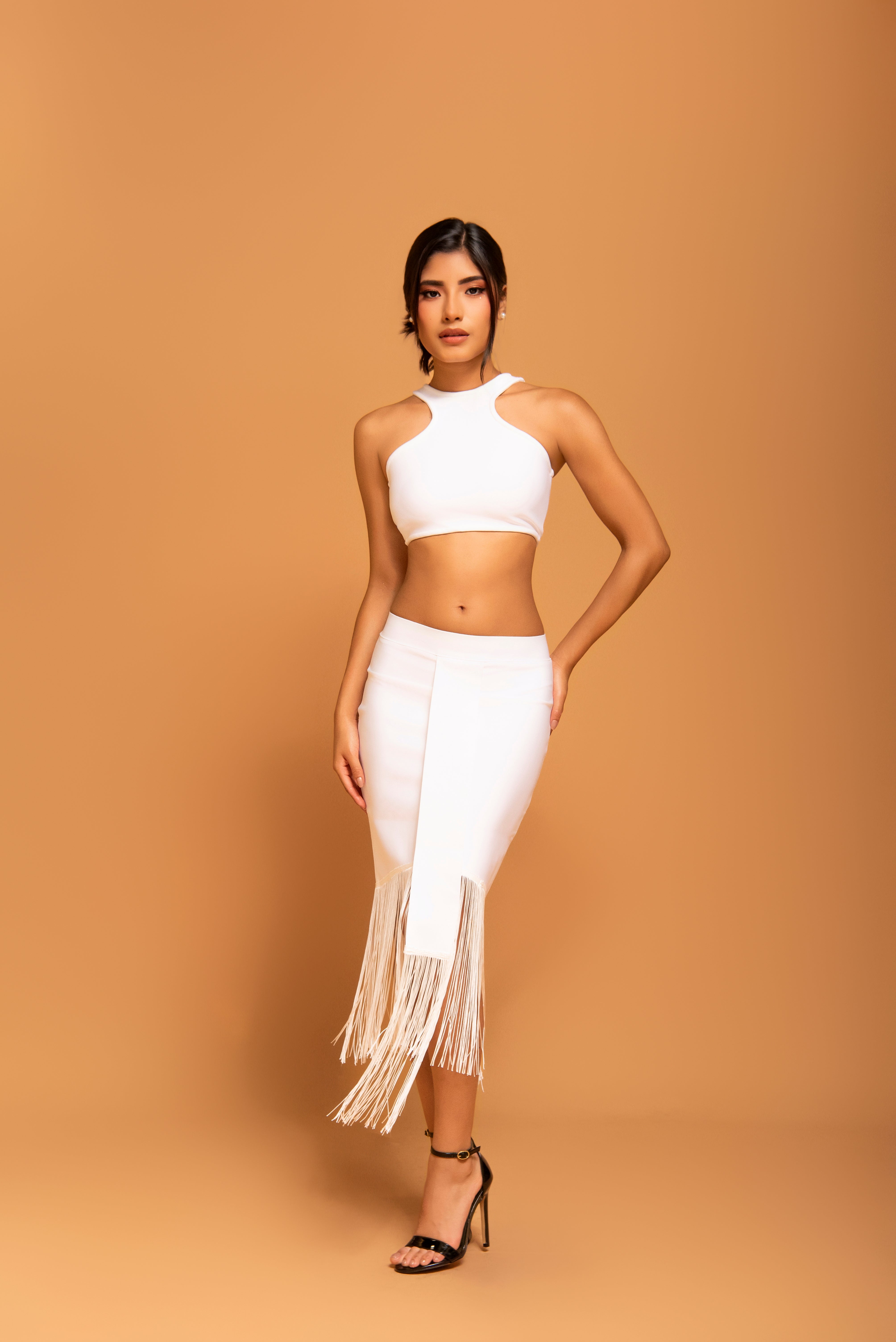 Este conjunto de dos piezas en blanco puro está diseñado para destacar. El top crop de cuello tipo halter y corte atlético ofrece una estructura limpia y moderna, mientras que la falda midi de talle alto se convierte en la protagonista gracias a su espectacular bajo de flecos largos. Los flecos añaden una dimensión de movimiento hipnótico, creando un look dinámico que fusiona la elegancia contemporánea con un espíritu bohemio de lujo.