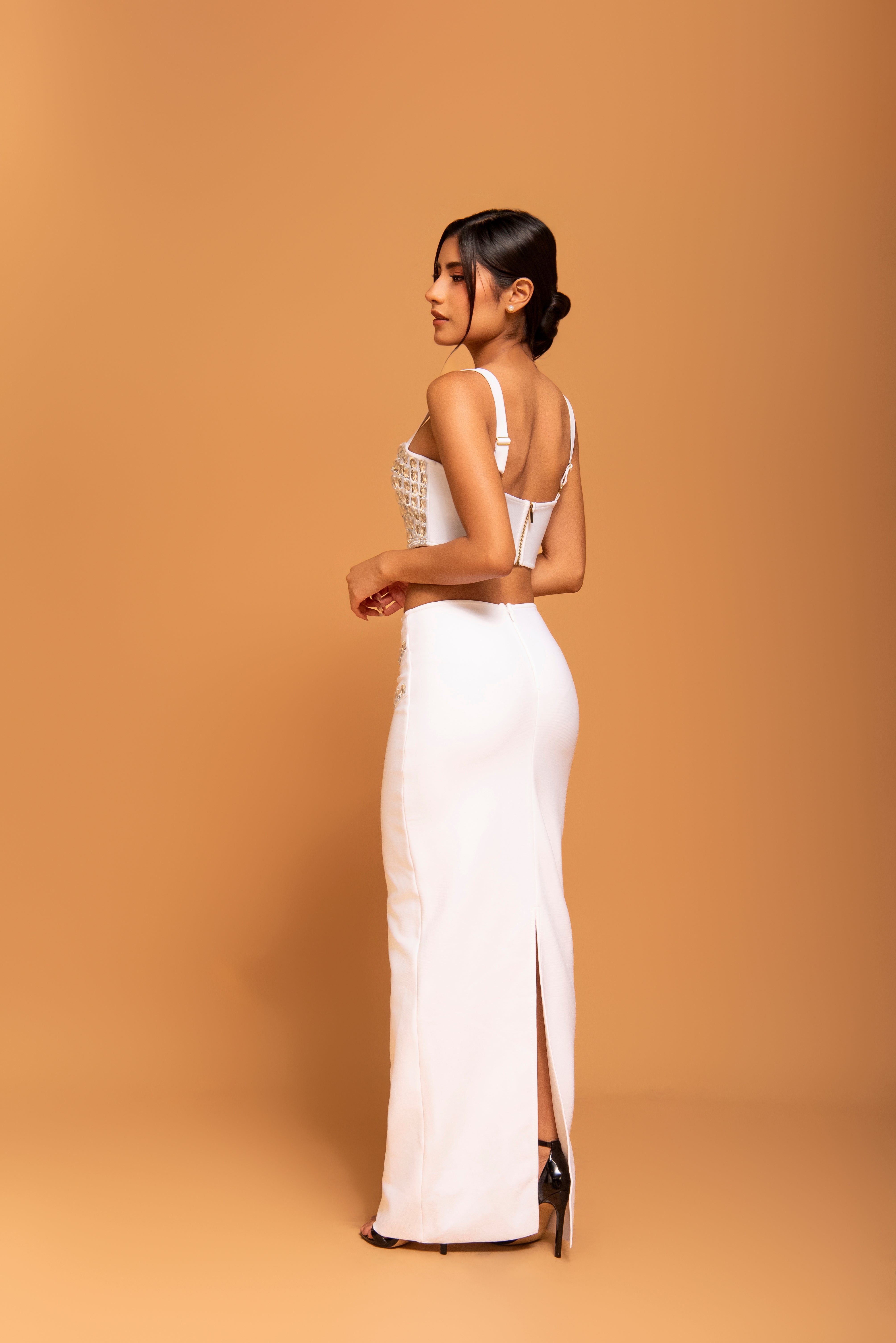 Este impecable set de dos piezas en blanco nupcial combina una falda larga de talle alto con un deslumbrante top crop de escote cuadrado. El diseño destaca por sus múltiples filas de cristales y pedrería plateada que adornan tanto el busto como la cadera, creando un patrón lineal que aporta estructura y un brillo excepcional. Es una pieza que equilibra una silueta clásica con detalles de lujo contemporáneo para una imagen radiante.