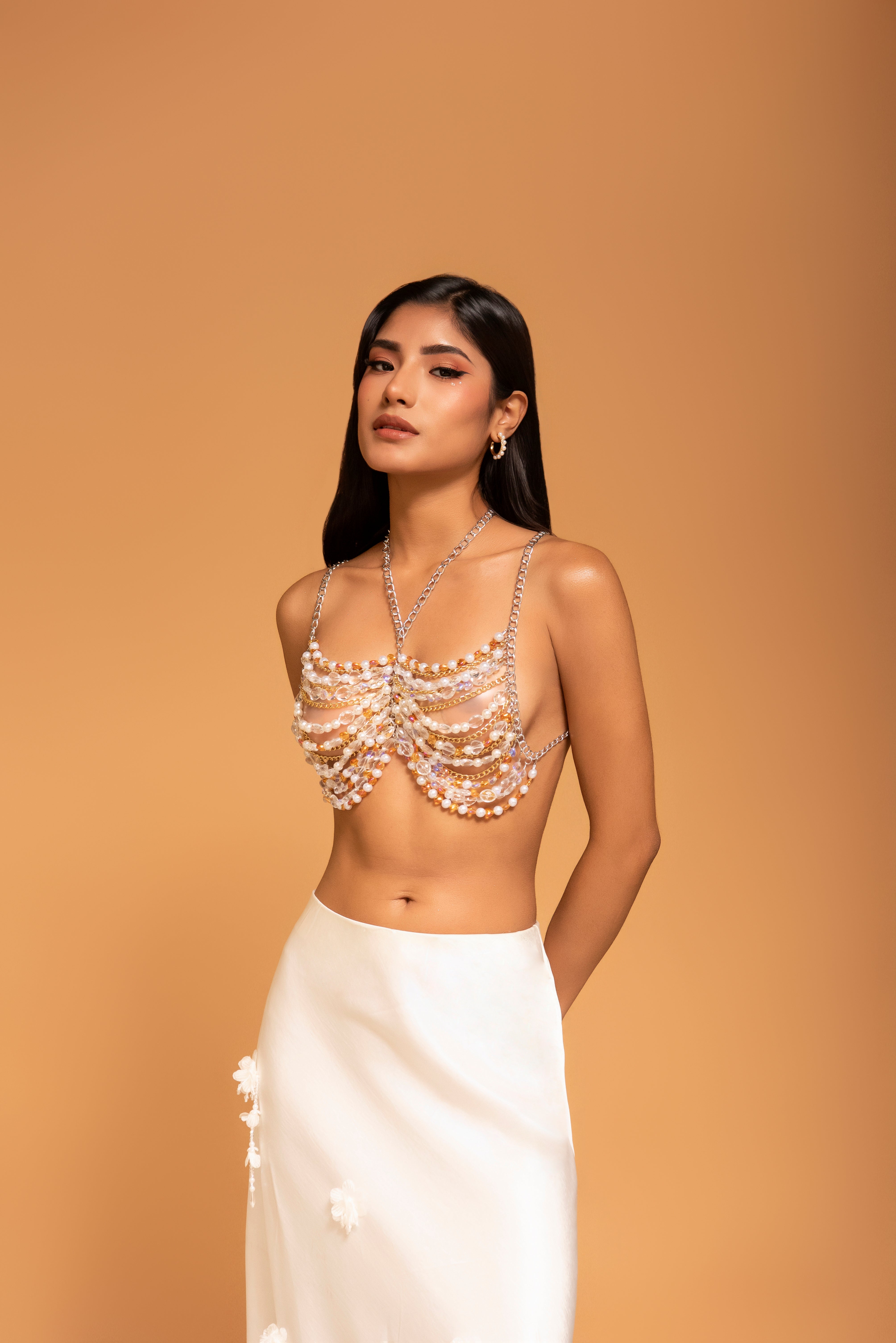 Una pieza de alta joyería textil diseñada para brillar. Este top destaca por su intrincado tejido de perlas, cristales facetados y detalles en ámbar, entrelazados con delicadas cadenas doradas. Es el equilibrio perfecto entre la elegancia clásica y la audacia vanguardista, ideal para iluminar la silueta con un resplandor cálido y lujoso.