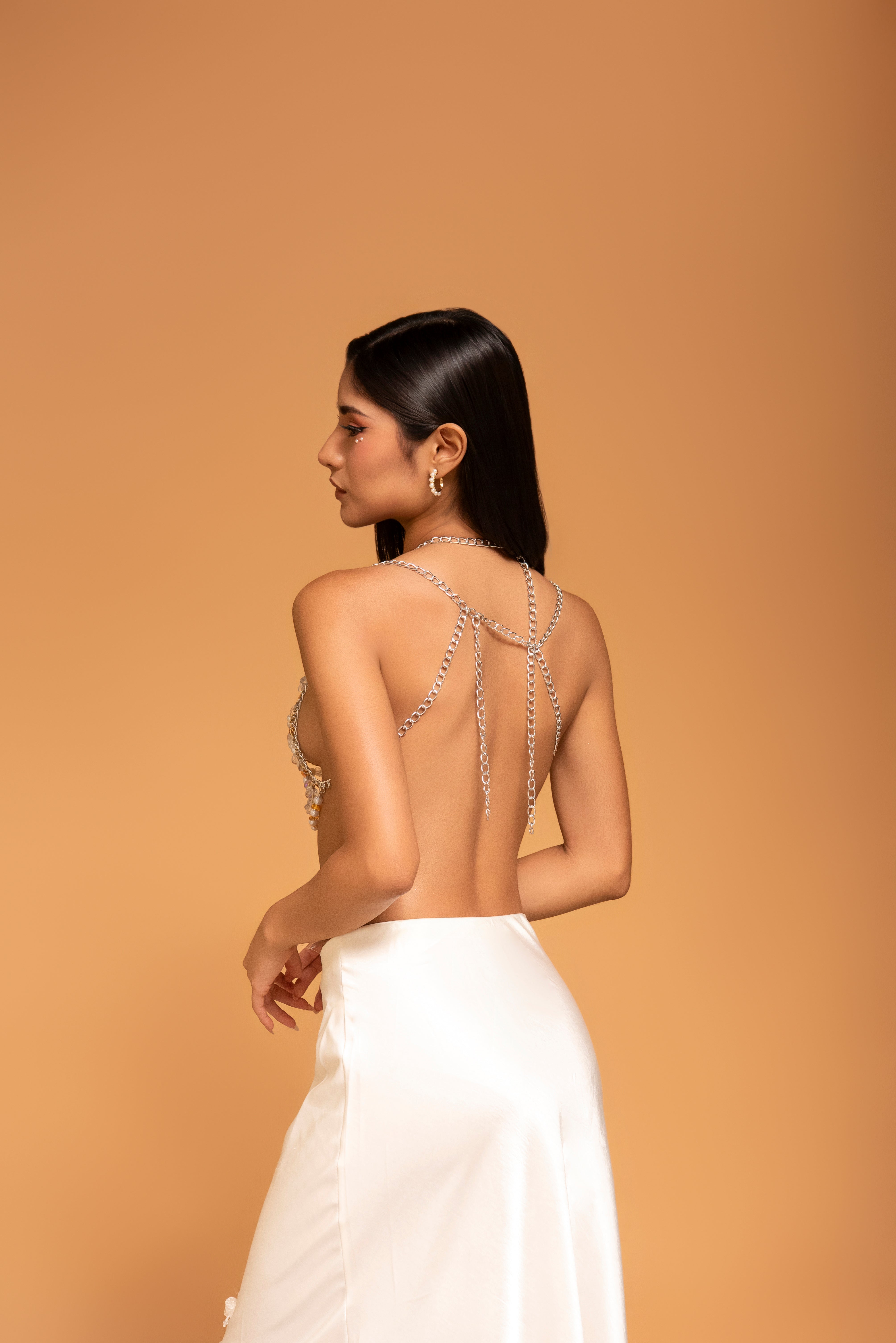 Combínalo con una falda larga de satén blanco (como en la foto) para un look de gala veraniego o evento de playa de alto nivel.
