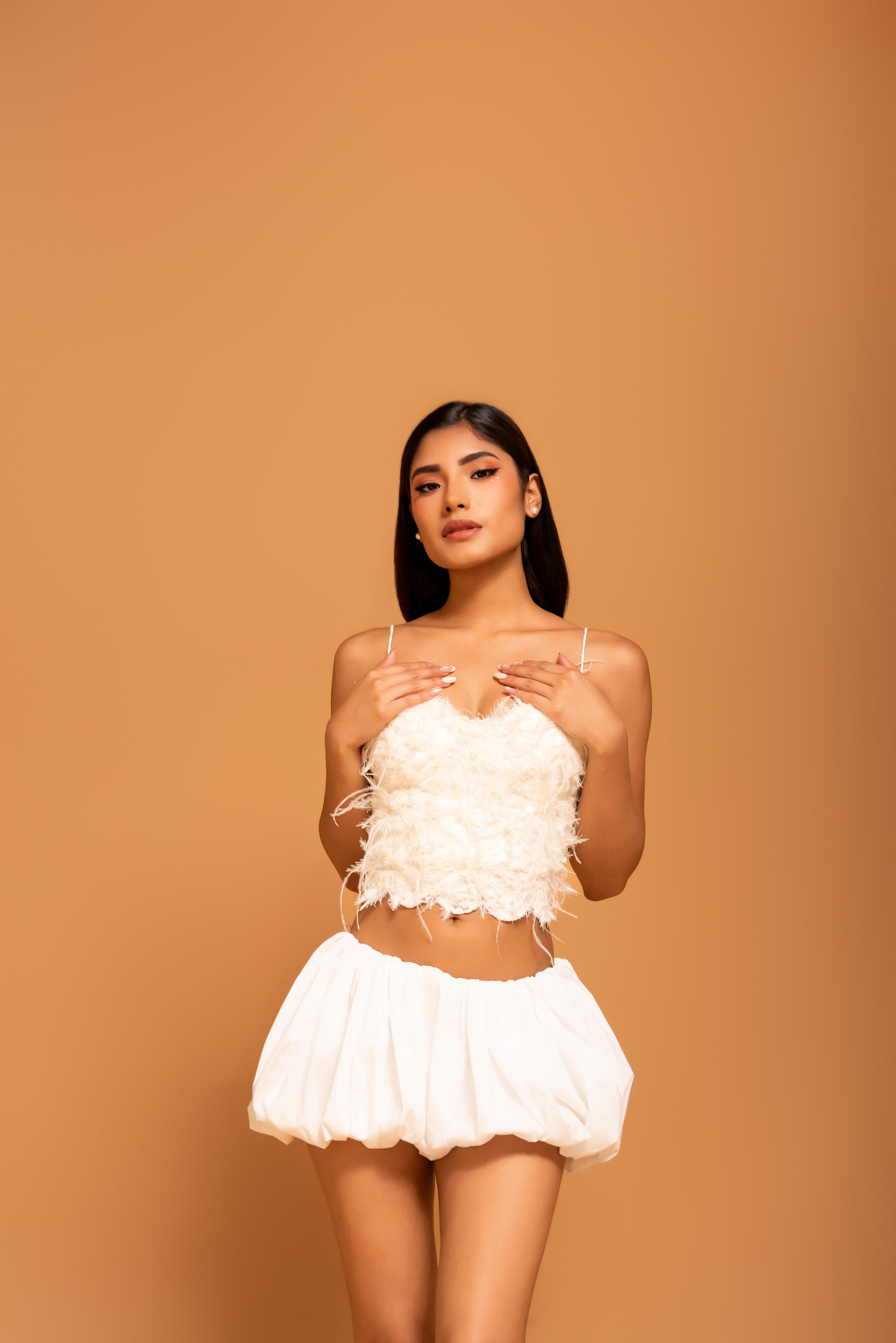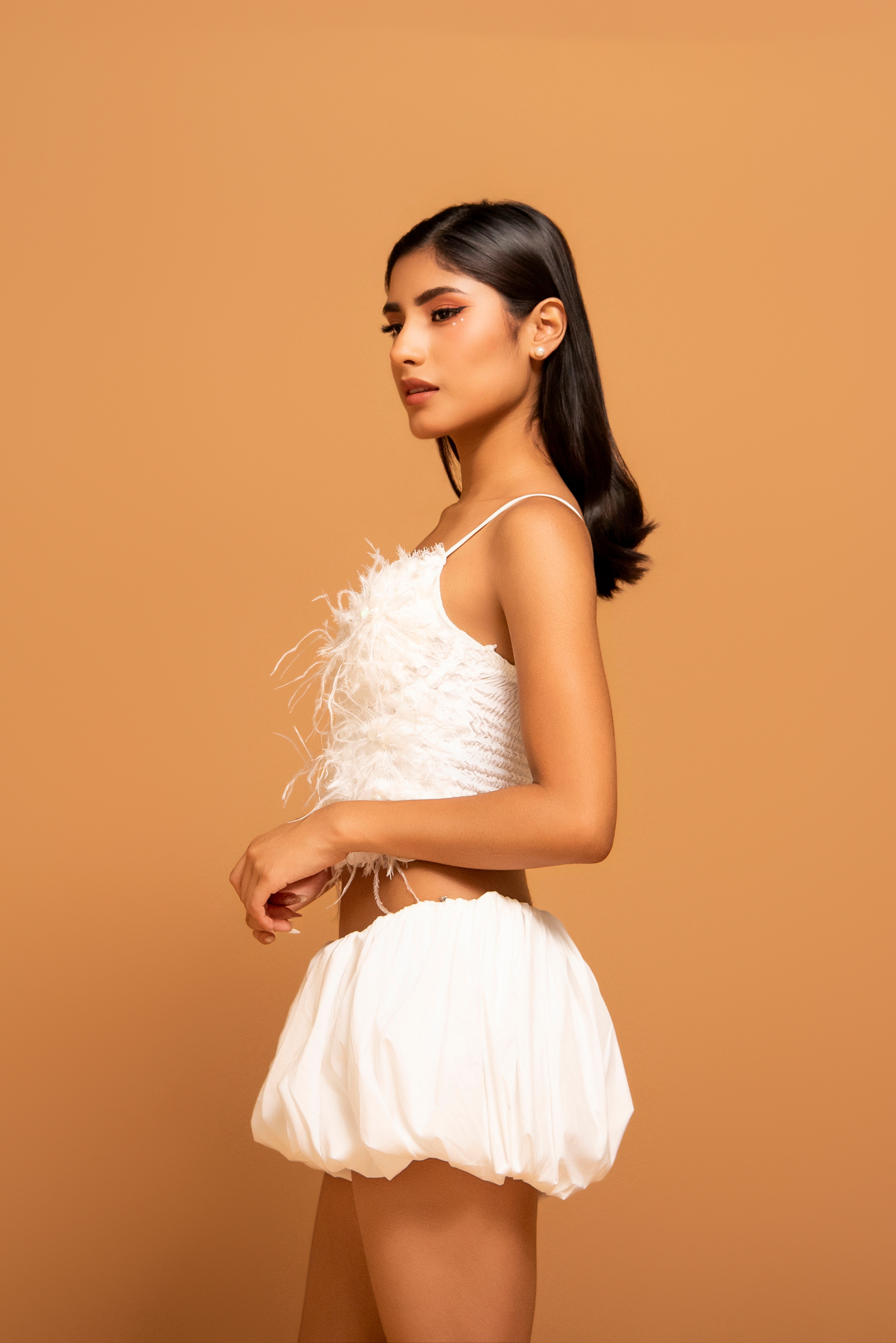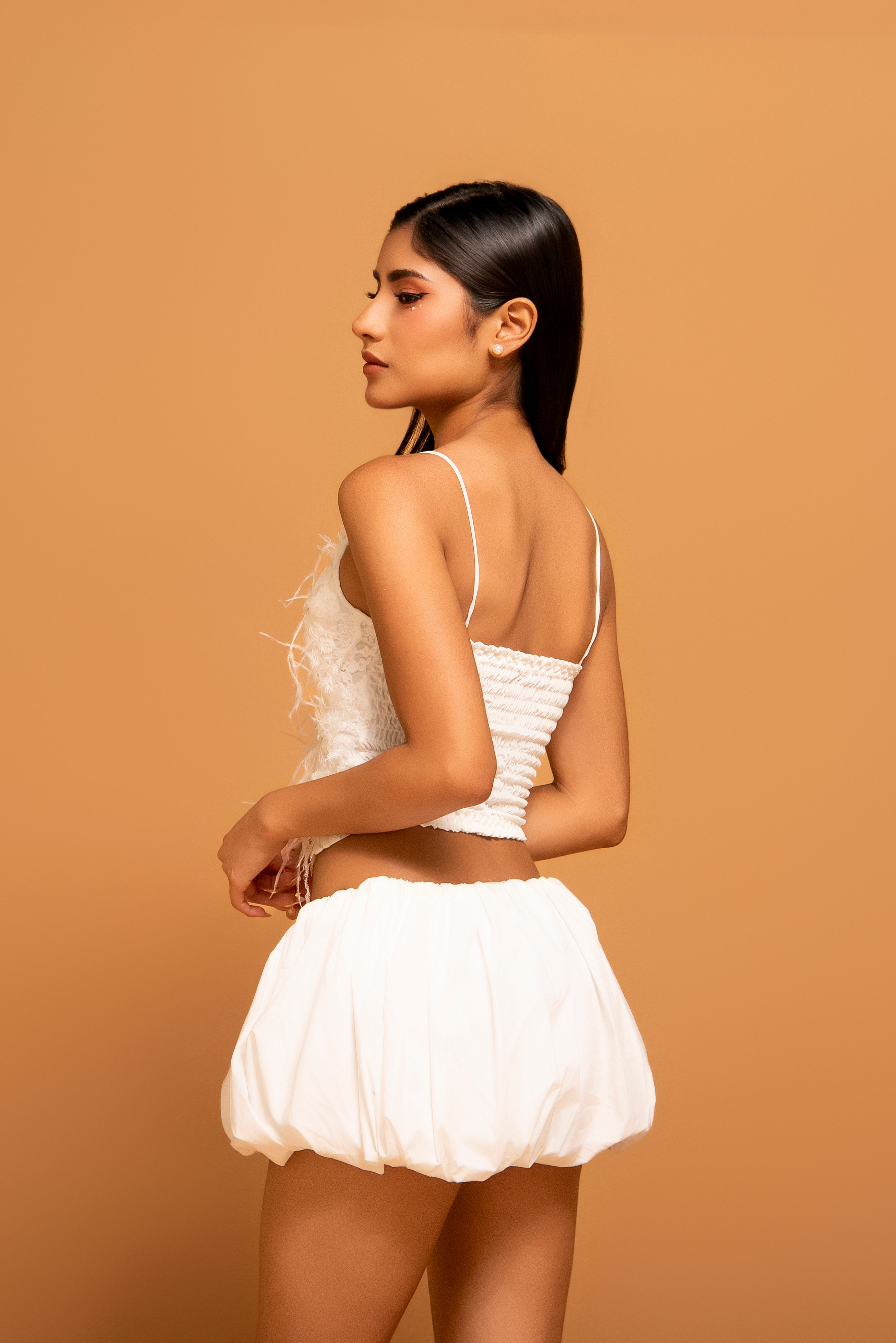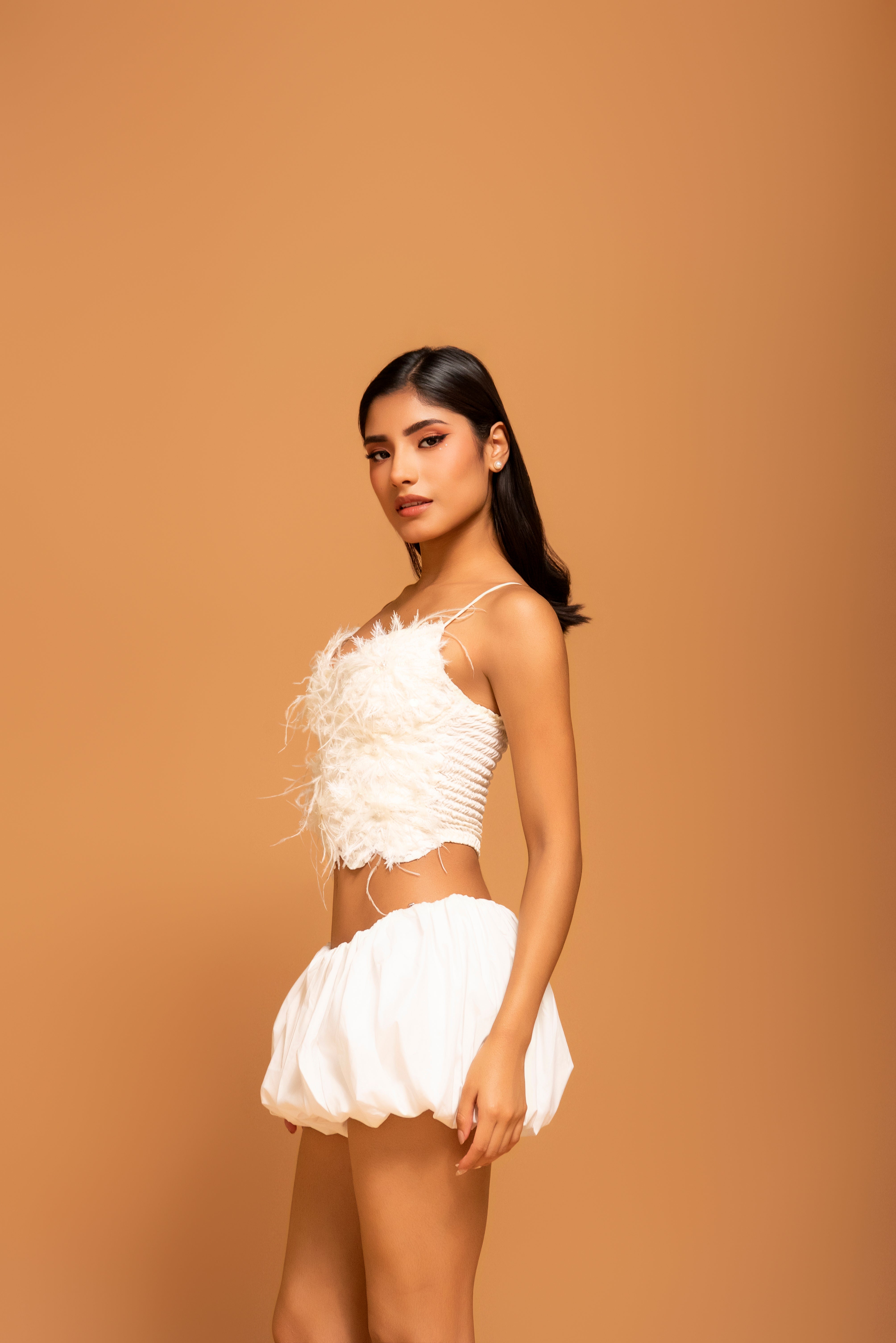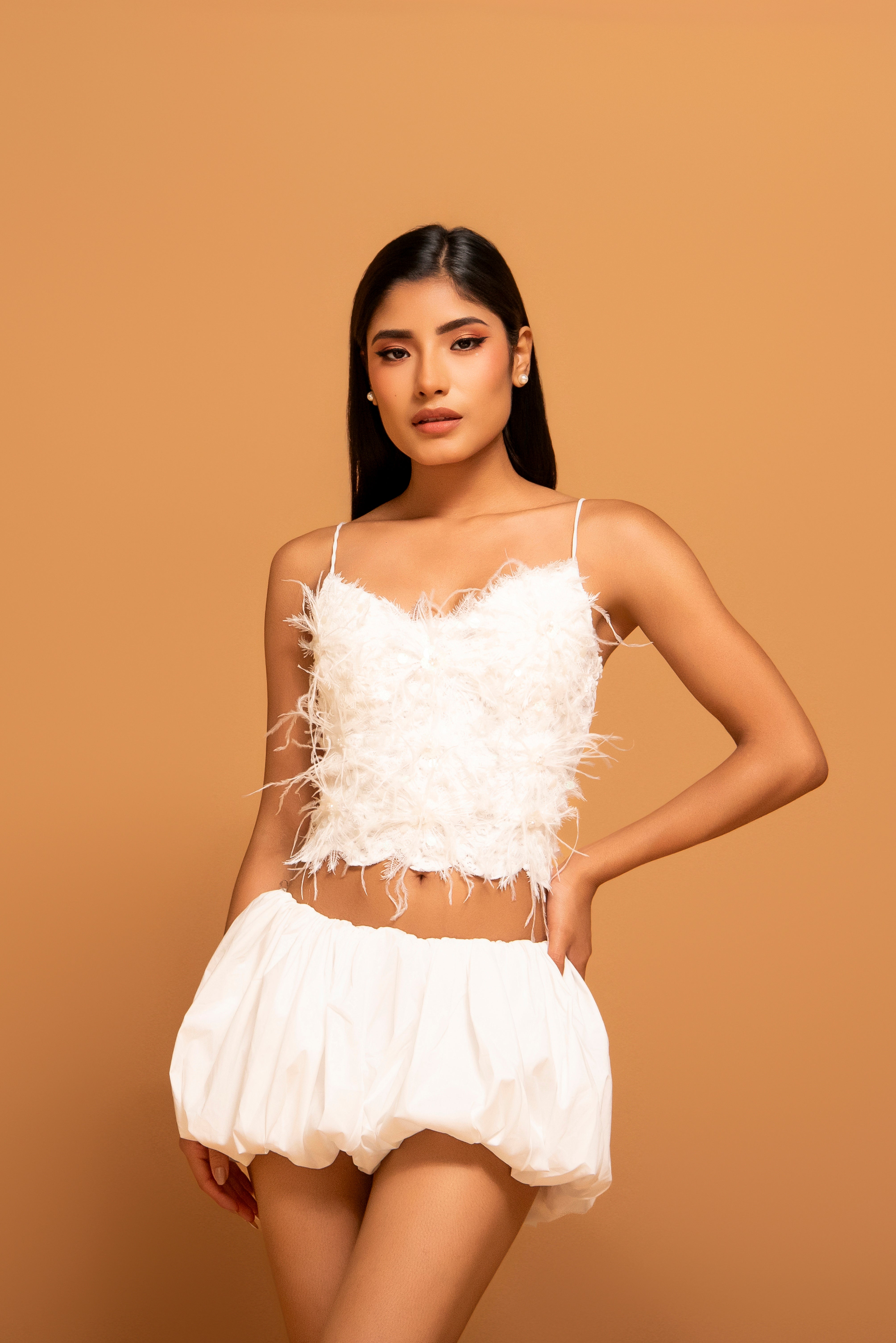 Una pieza delicada que captura la esencia de la feminidad moderna. Este top corto está recubierto con suaves plumas sintéticas y detalles de encaje, creando una textura visualmente rica y con movimiento. Sus tirantes ultrafinos tipo espagueti equilibran el volumen del cuerpo, ofreciendo un look fresco, etéreo y sofisticado.