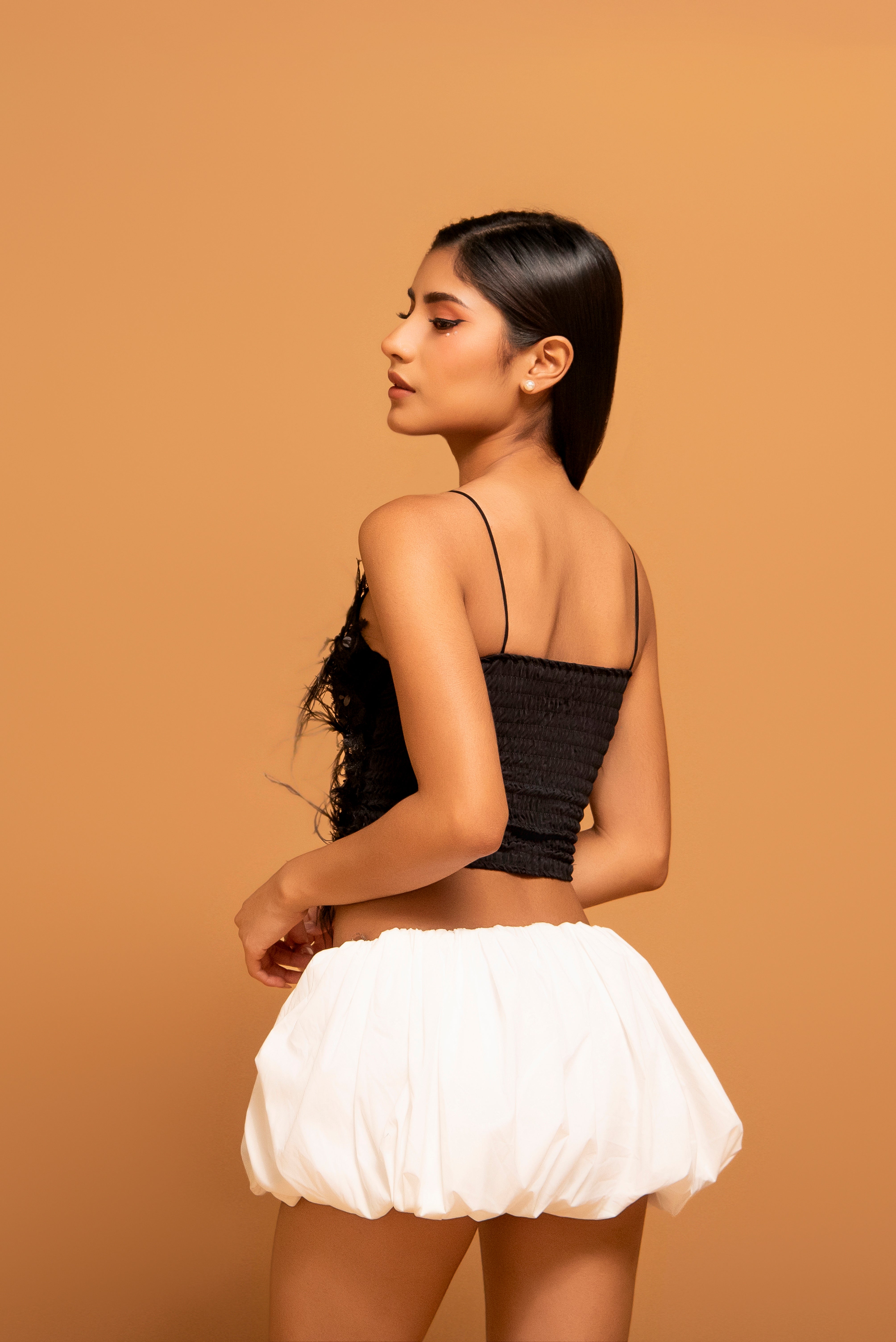 Combínalo con una falda globo (bubble skirt) a tono para un conjunto de impacto en eventos de verano, fiestas blancas o sesiones editoriales.