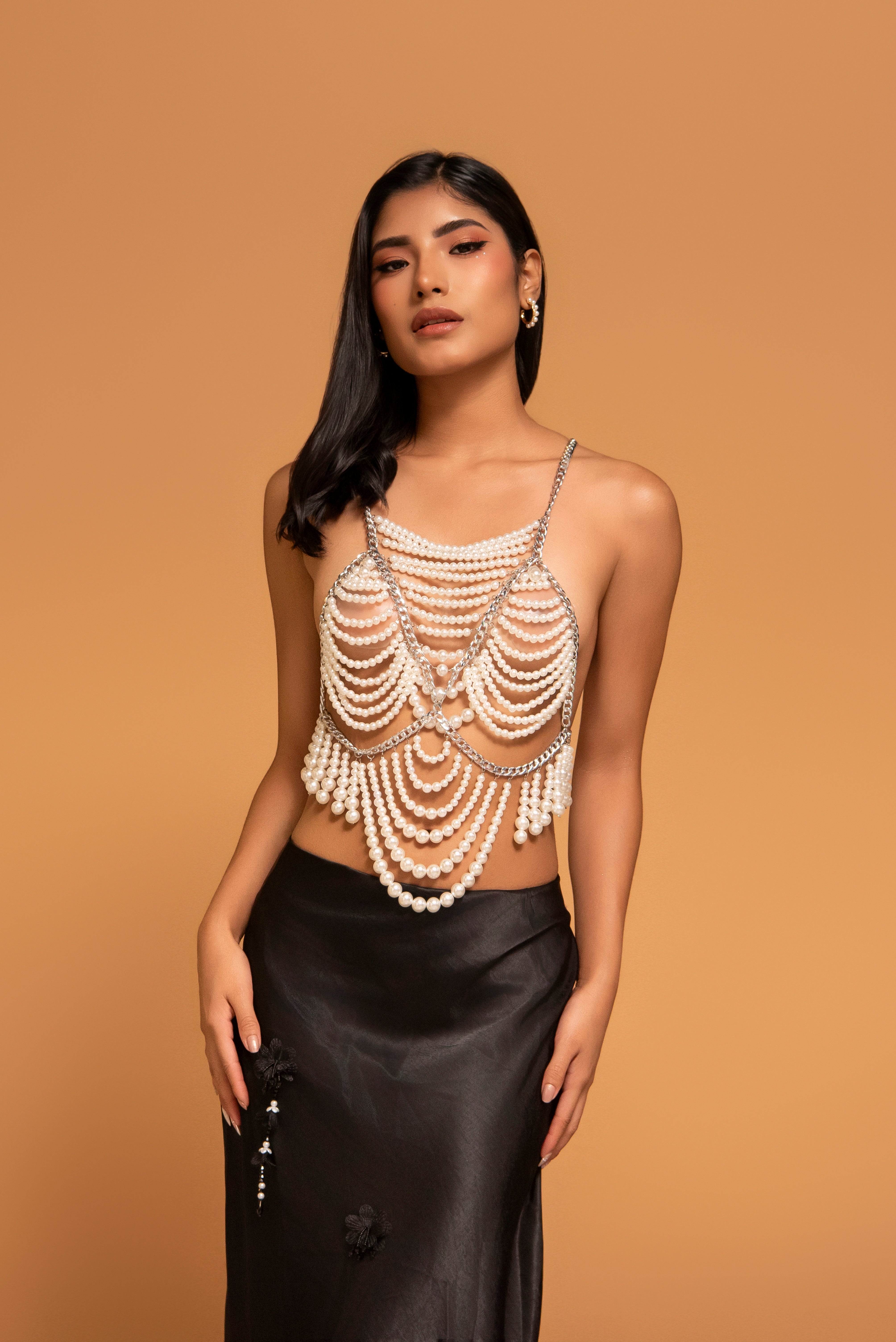 El modelo Isabella es una obra maestra de simetría y luz. Este top artesanal se caracteriza por sus múltiples hileras de perlas blancas perfectamente alineadas, que forman una estructura de "petos" superpuestos sostenidos por delicadas cadenas plateadas. Su diseño frontal se extiende hacia el torso con caídas circulares que estilizan la figura, ofreciendo un brillo nacarado que evoca sofisticación pura y un estilo de alta costura.