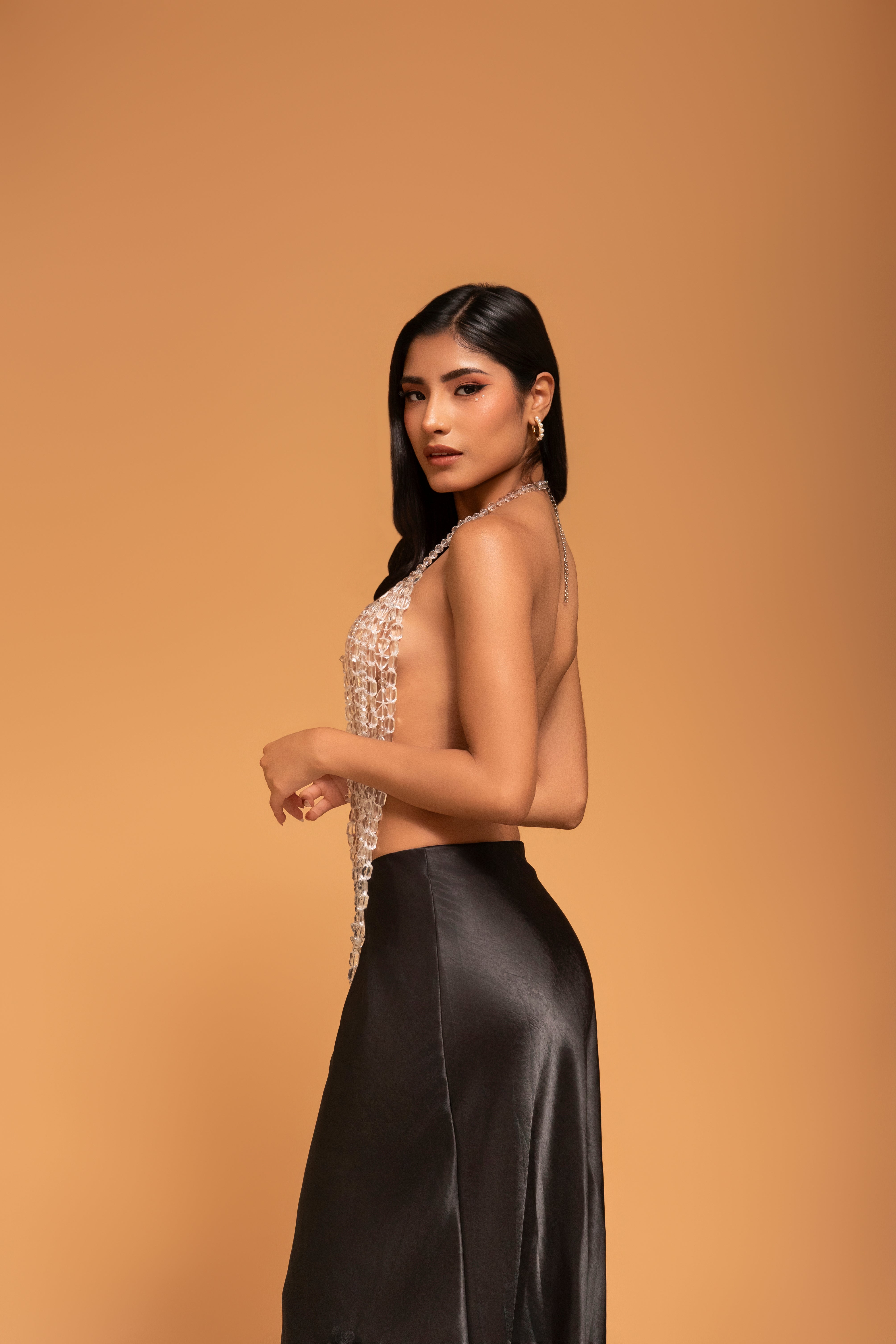 El modelo Aura es una pieza escultural diseñada para el máximo impacto visual. Este top se distingue por sus múltiples cascadas de cristales traslúcidos que caen elegantemente sobre el torso, creando un juego de luces y transparencias inigualable. Con un diseño de escote profundo y una estructura que fluye con el movimiento del cuerpo, es la personificación del lujo vanguardista y la sofisticación audaz.