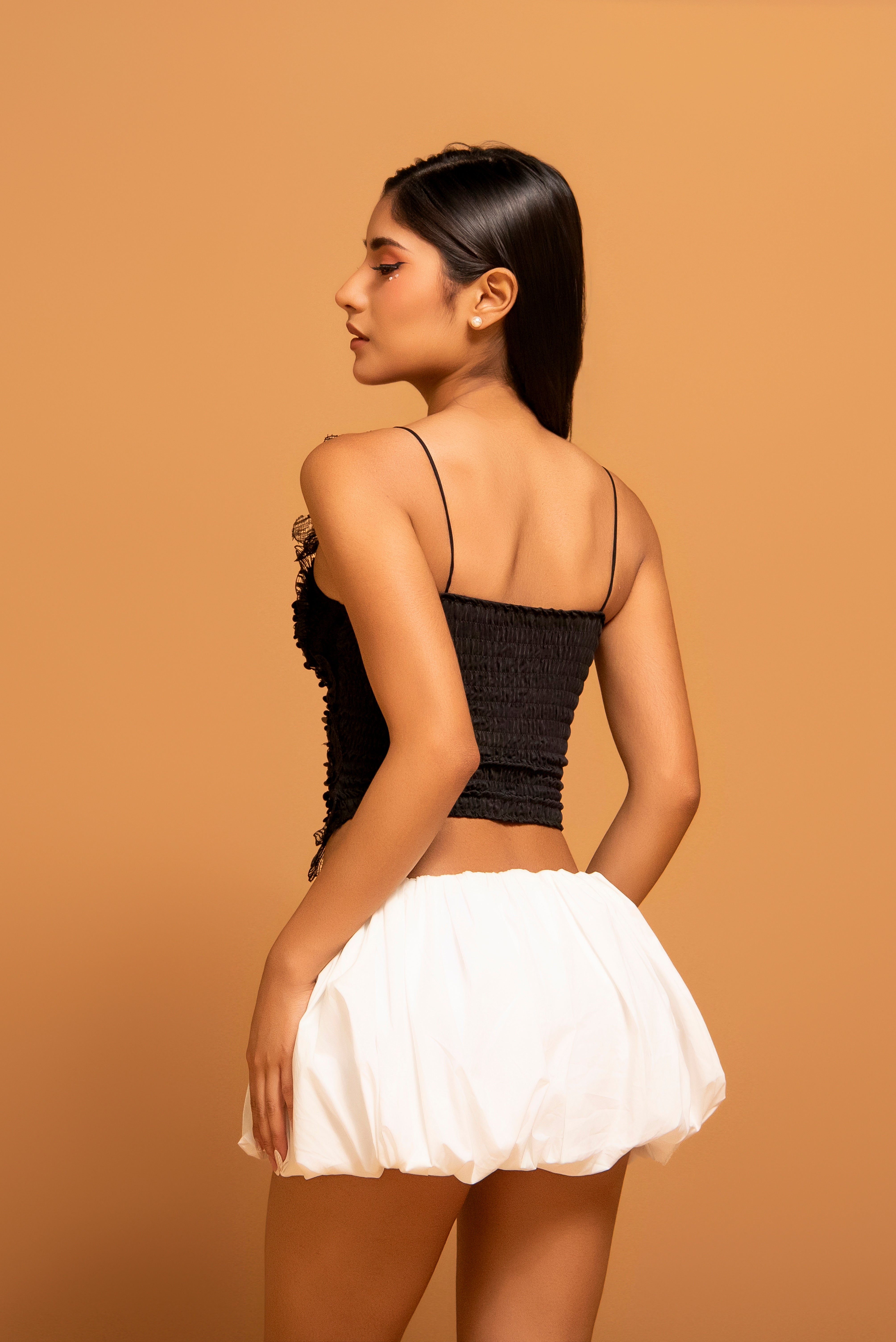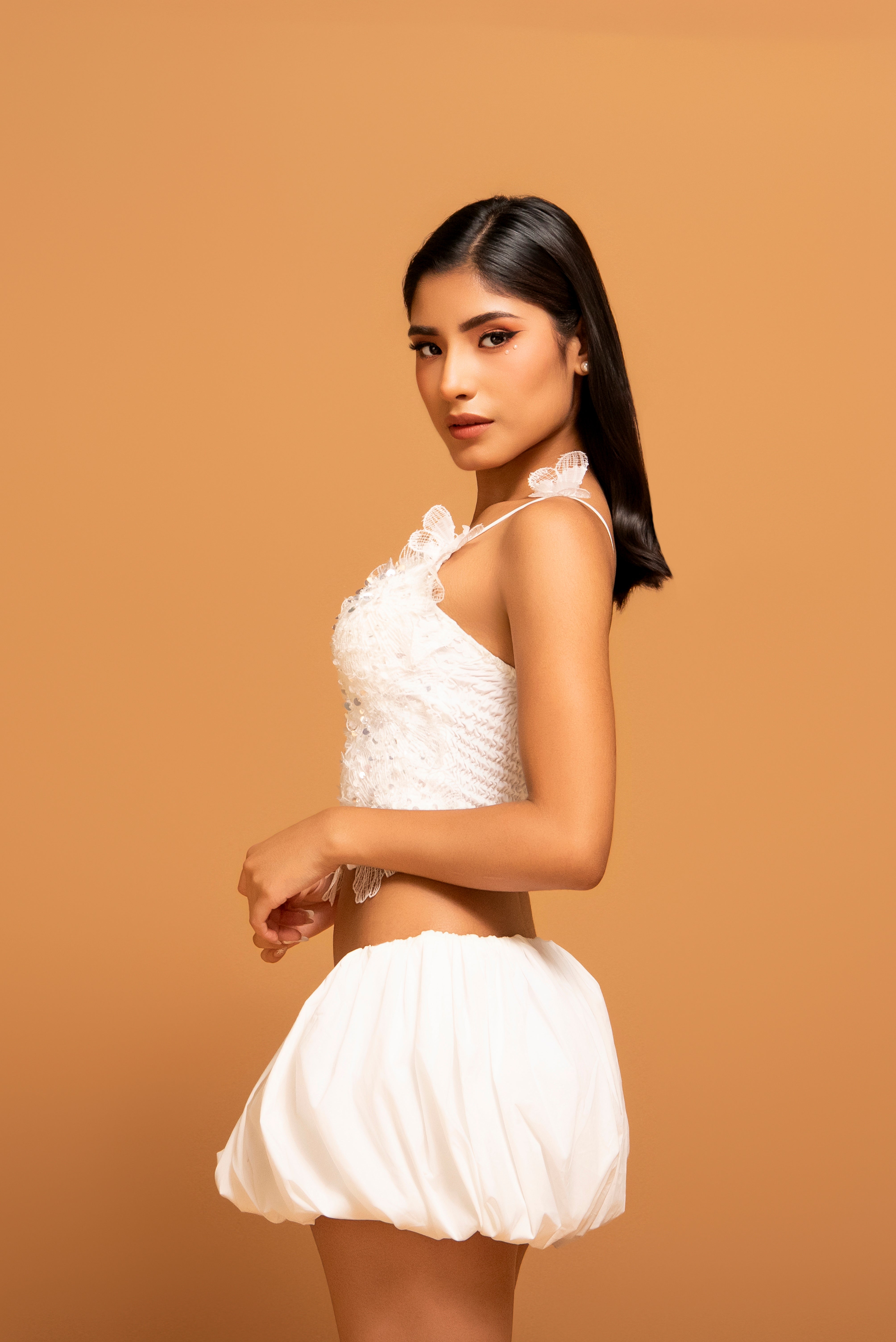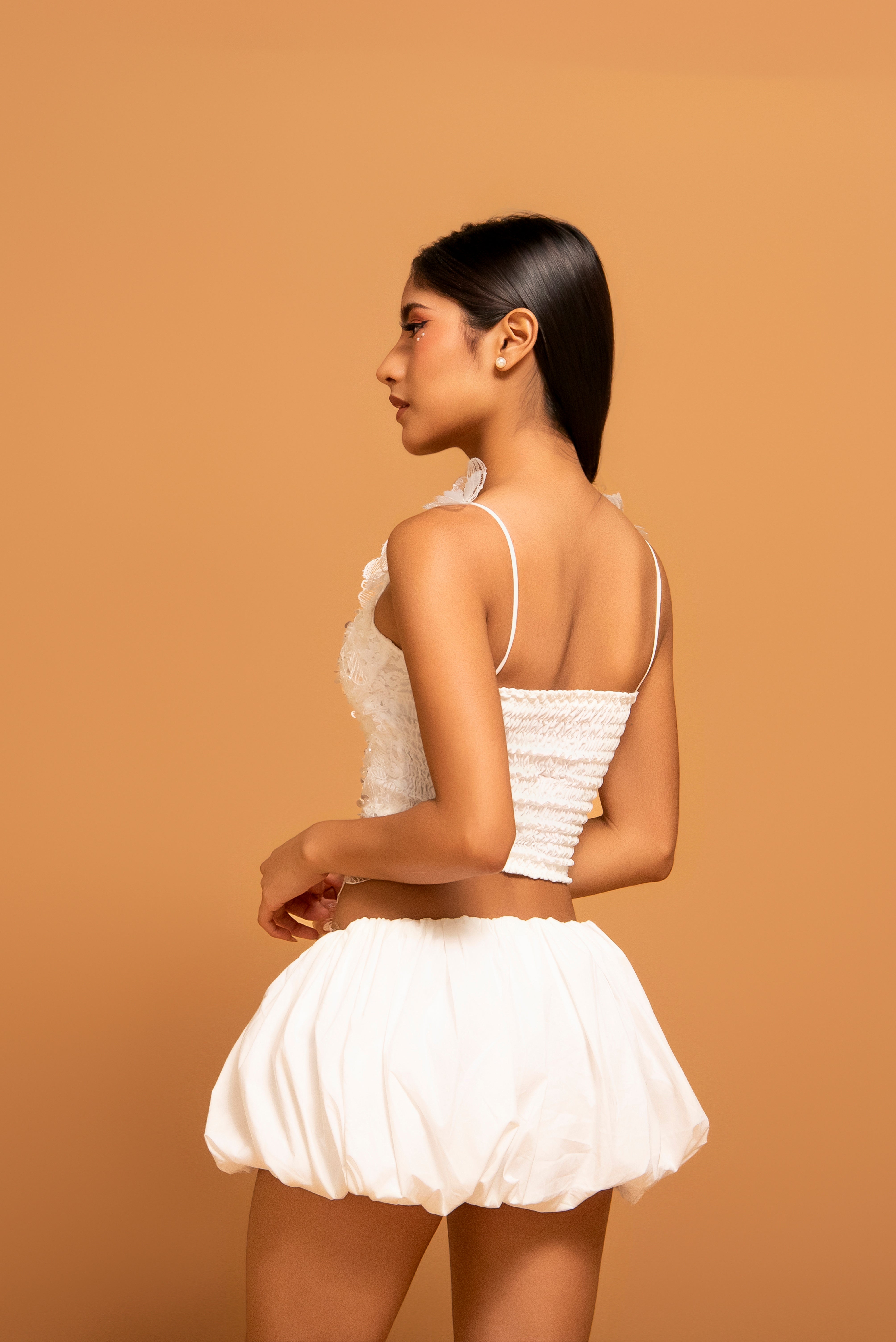 Un look de dos piezas que redefine el estilo contemporáneo. El top corto de encaje destaca por sus aplicaciones florales 3D, lentejuelas y bordes que aportan una textura rica y lujosa. Se combina perfectamente con una falda "bubble" (globo) en blanco marfil, cuyo volumen escultural crea una silueta moderna y audaz.