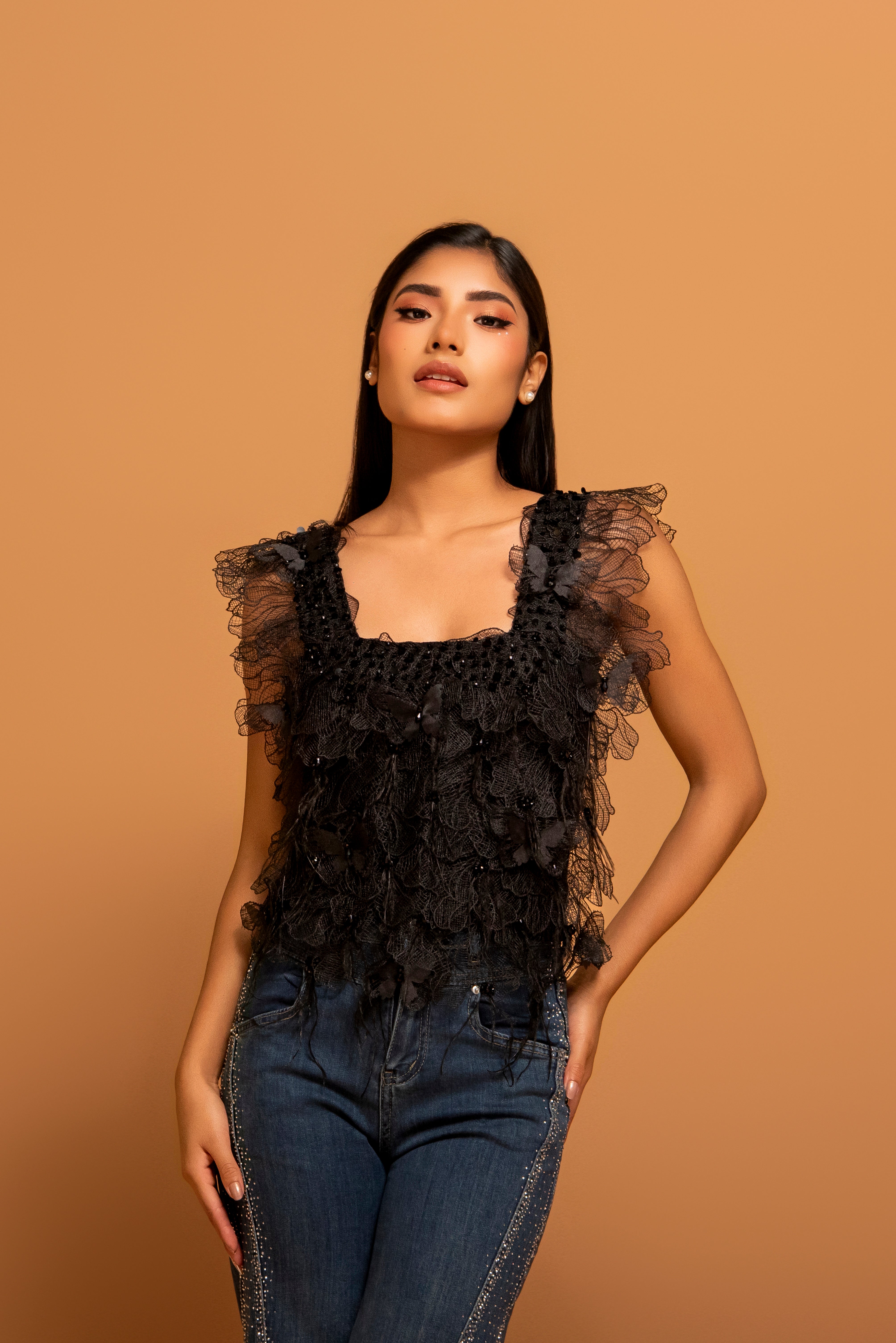 Este top negro se caracteriza por su exuberante textura de mariposas tridimensionales confeccionadas en encaje calado, que crean un efecto de volumen y movimiento único. Presenta un escote cuadrado, tirantes anchos con volantes texturizados y sutiles detalles de pedrería azabache que aportan un brillo nocturno sofisticado.