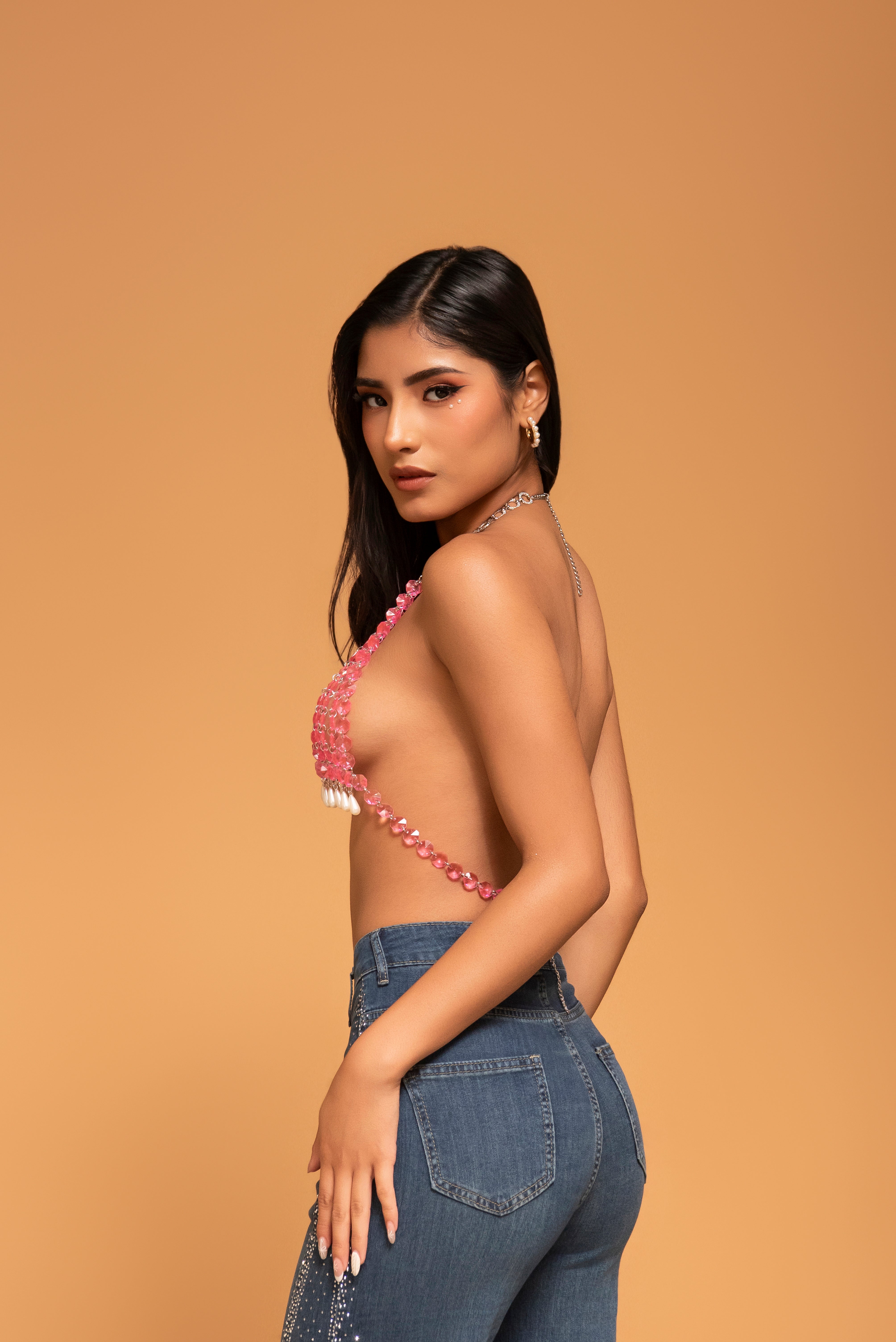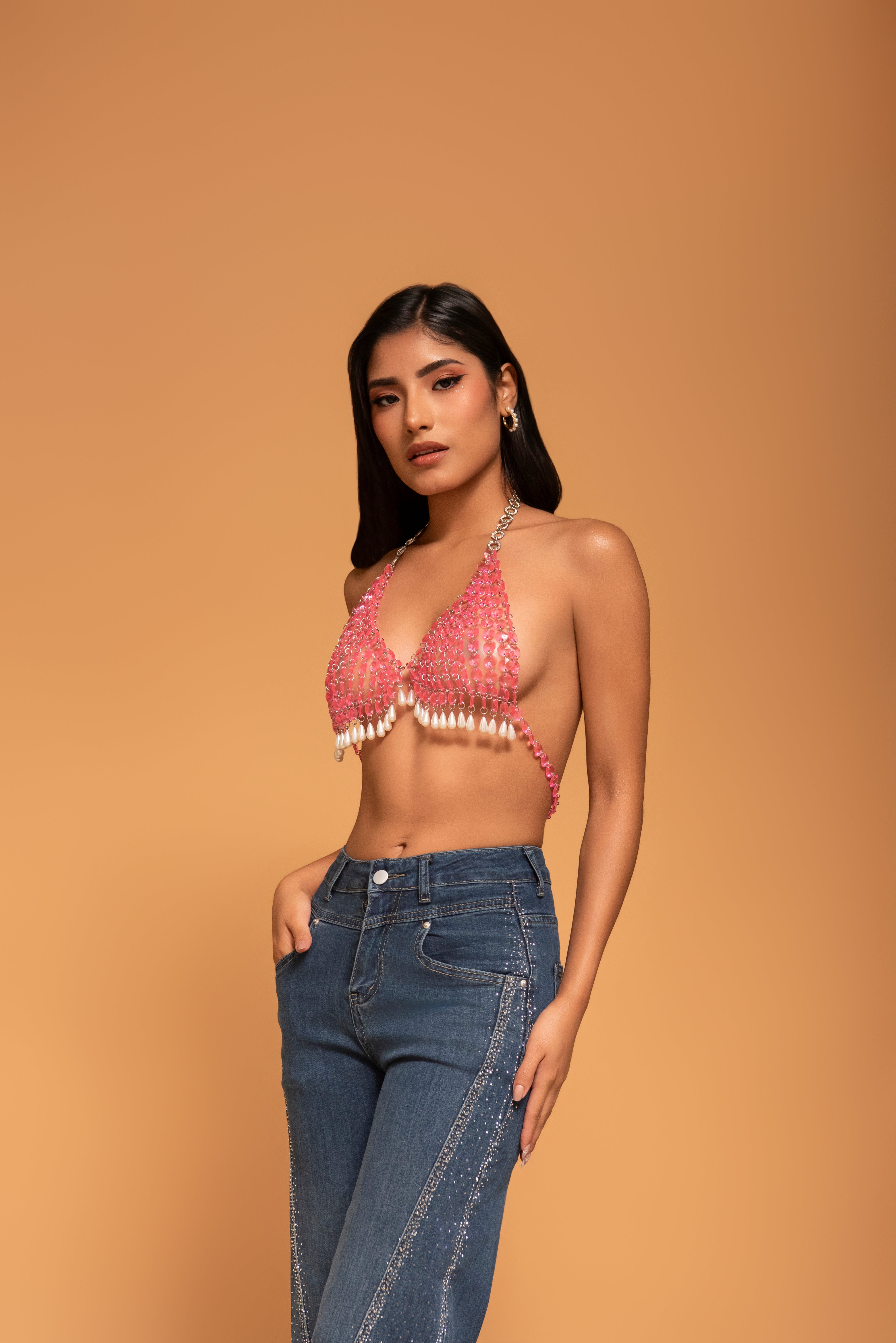 El modelo Mayra es la definición de feminidad y romanticismo audaz. Este top estilo bralette destaca por su vibrante tejido de cristales facetados en tono rosa intenso, complementado con una hilera inferior de perlas en forma de gota que aportan movimiento y elegancia. Su diseño clásico de triángulo se eleva gracias al brillo de sus materiales, convirtiéndolo en una pieza joya irresistible.