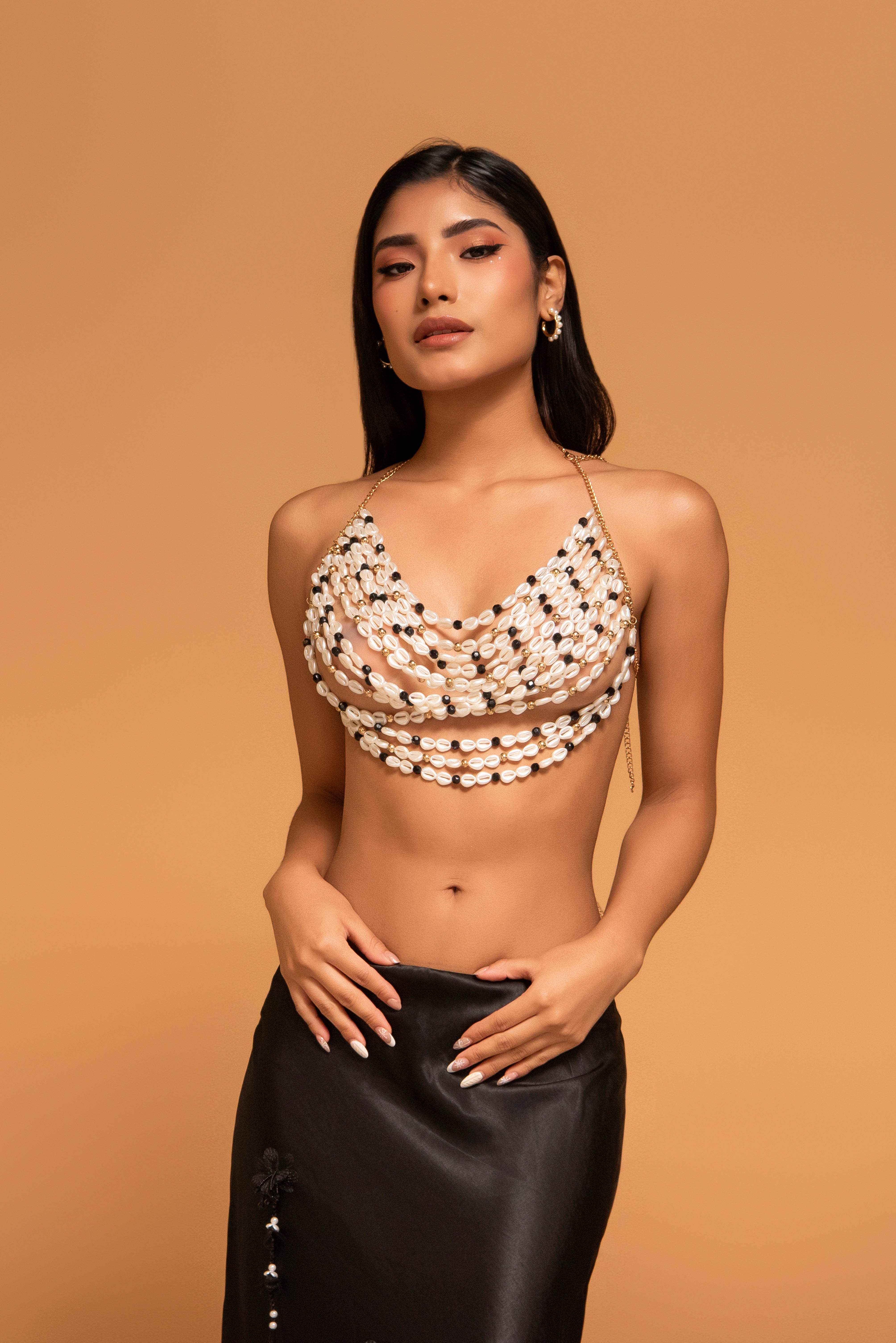 El modelo Mística es una pieza única que rinde homenaje a la belleza orgánica del océano. Confeccionado artesanalmente, este top destaca por sus múltiples hileras de caracoles naturales tipo cauri, delicadamente intercalados con cuentas negras y doradas sobre una estructura de cadenas finas. Es el diseño ideal para quienes buscan una estética boho-chic elevada, fusionando la frescura de la playa con el lujo de la alta joyería textil.