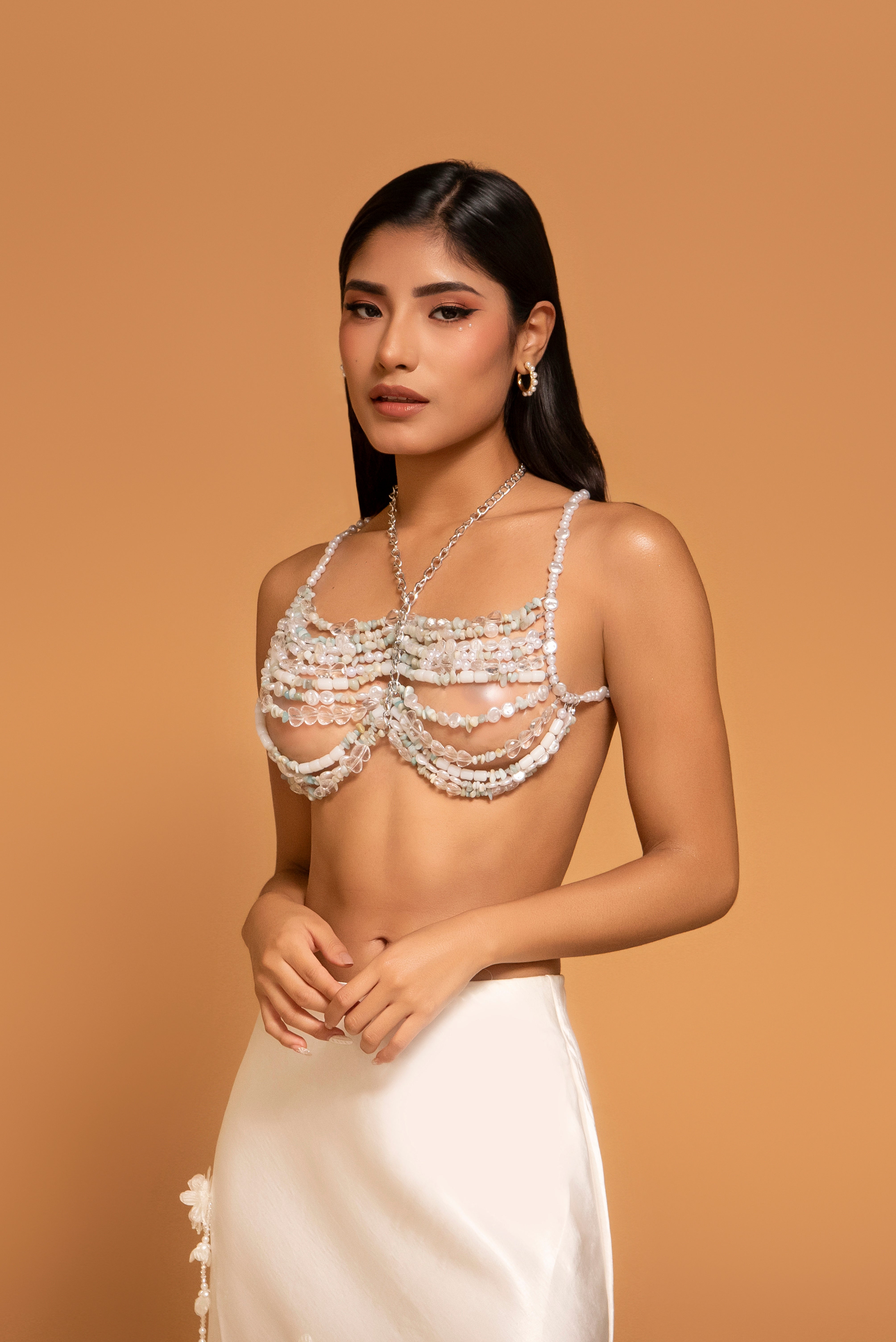 Una pieza artesanal de lujo que fusiona la joyería con la moda. Confeccionado con perlas de estilo natural y cuarzos , este top crea un efecto de "armadura etérea" que ilumina la piel. Es una prenda de edición limitada diseñada para quienes buscan un estilo audaz, sofisticado y único.