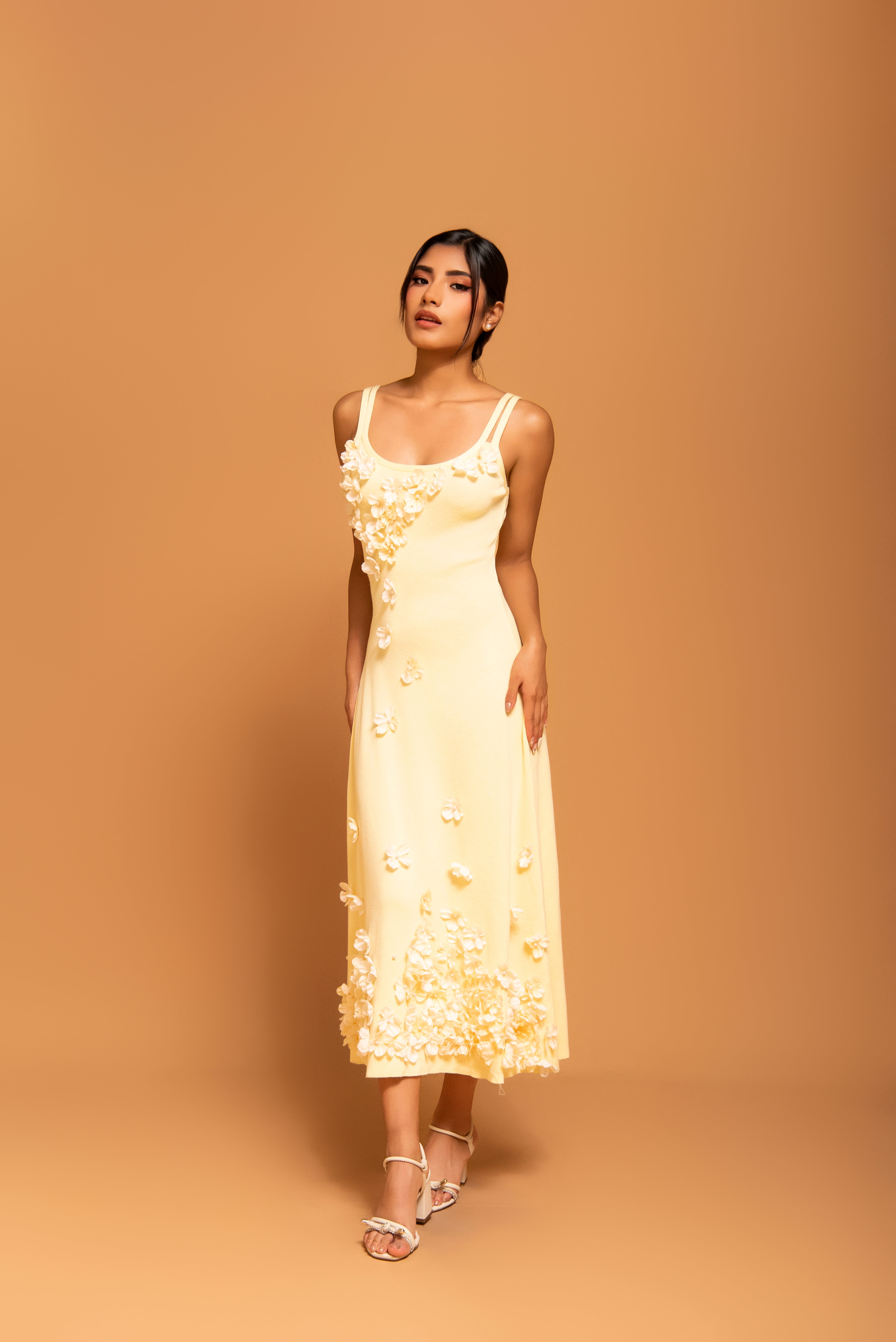 Una pieza que celebra la feminidad y la alegría. El vestido "Silvia" destaca por su color amarillo pastel y una delicada lluvia de flores 3D que parecen cobrar vida sobre el tejido. Su diseño de tirantes dobles y escote redondeado crea un marco elegante para el rostro, mientras que su corte maxi ofrece una silueta alargada y sofisticada que se adapta a diferentes tipos de cuerpo con absoluta fluidez.