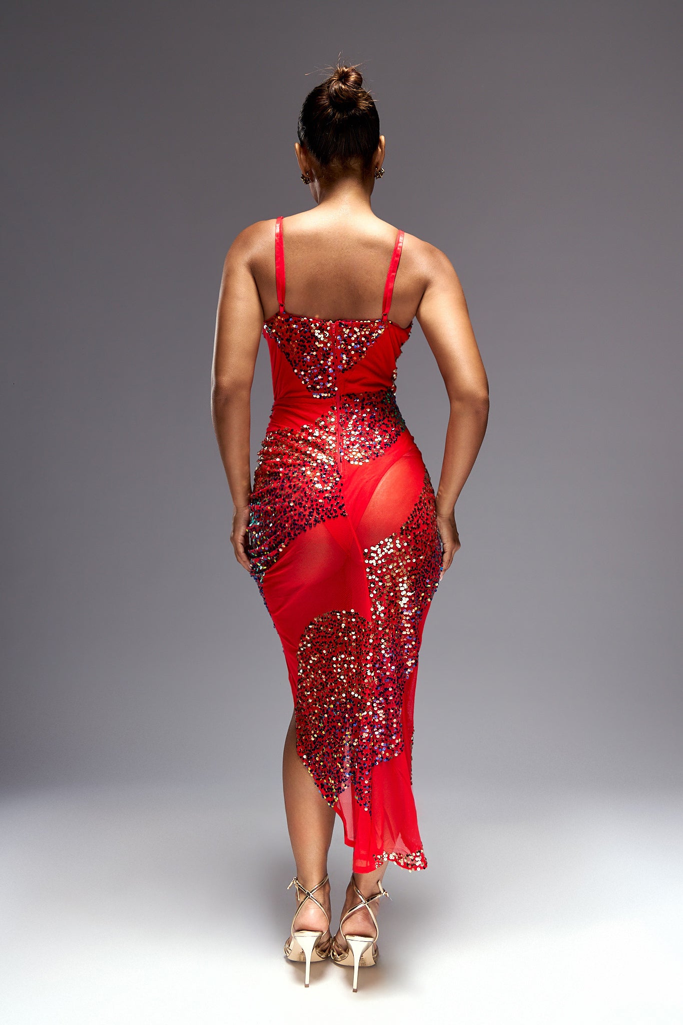 ¡Enciende la noche con un brillo explosivo! El vestido Nebula en su versión escarlata es una pieza de glamour puro, diseñada para capturar todas las miradas con su espectacular brillo y su atrevida silueta. Es la elección perfecta para una noche inolvidable, con un toque extra de pasión.