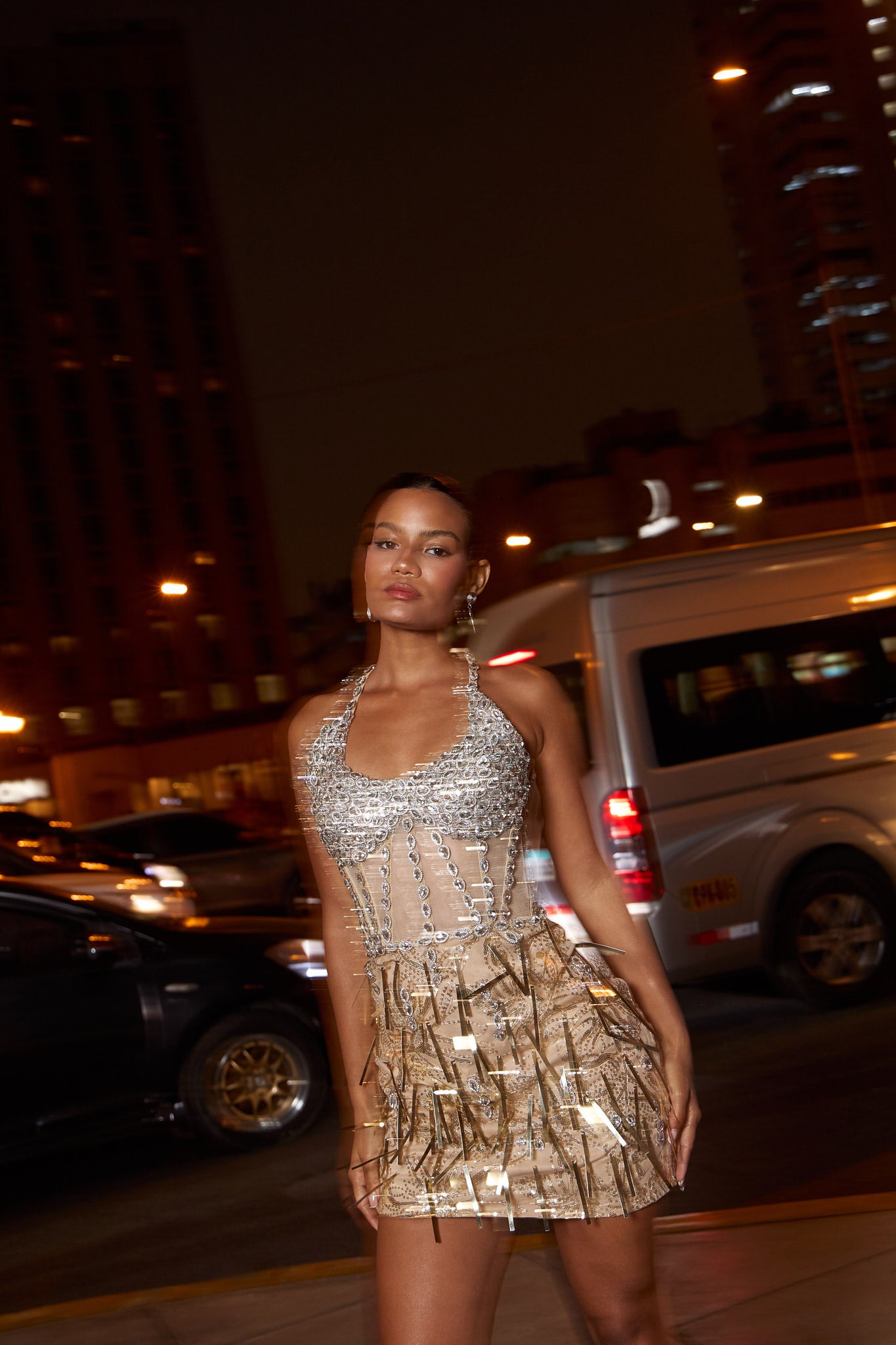 ¡La alegría de la noche con una paleta de tonos cálidos y fríos! El mini vestido Oriana es una pieza de diseño que fusiona la sofisticación del nude con el resplandor de los metales preciosos. Su bordado en relieve y su silueta de corsé garantizan una presencia de alto glamour .