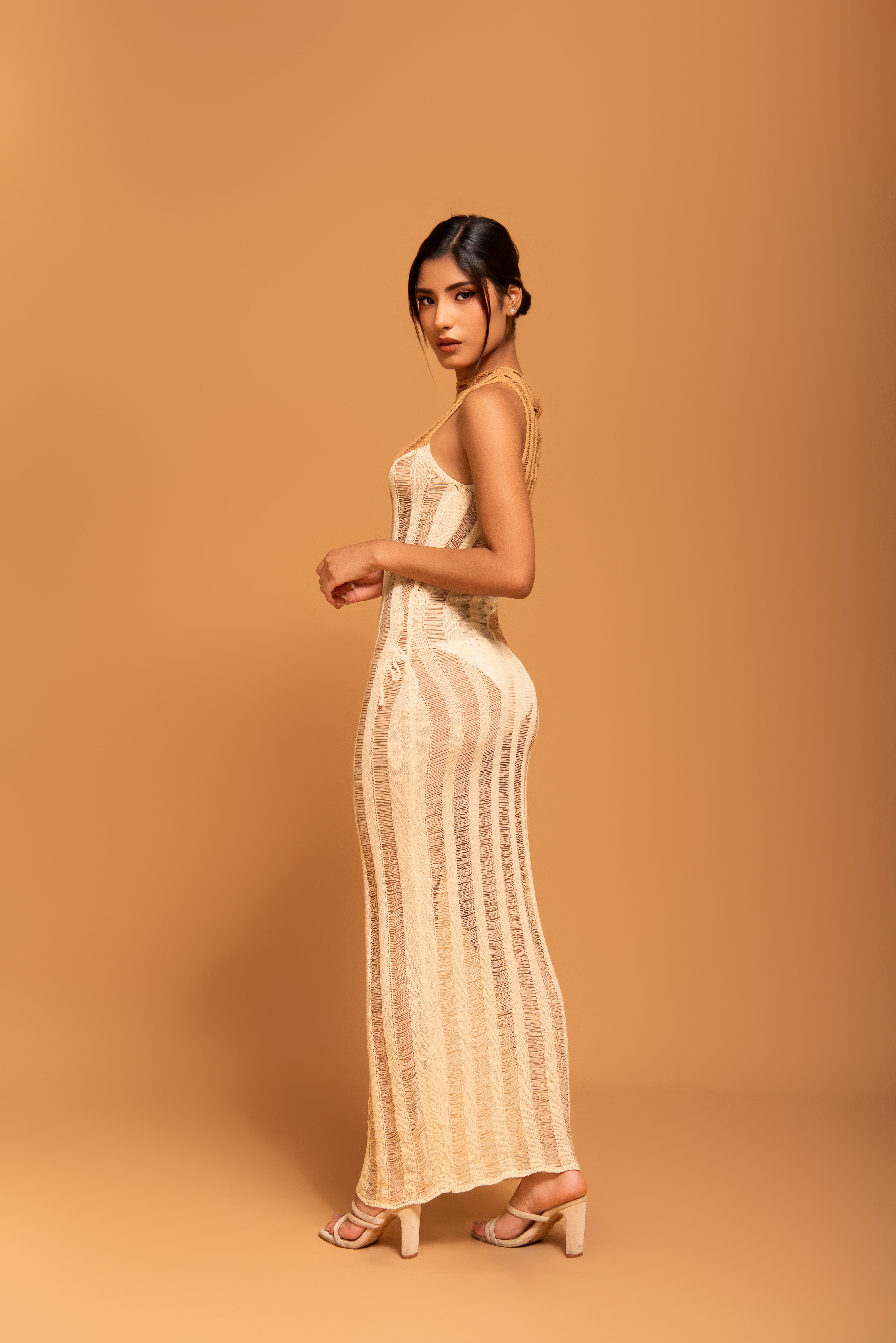 Una pieza de vanguardia que juega con la transparencia y el arte geométrico. Este vestido largo destaca por su diseño de punto calado vertical en dos tonalidades contrastantes: beige arena y crema. El patrón asimétrico y las líneas fluidas crean un efecto visual que alarga y estiliza la figura, fusionando la técnica artesanal con una estética minimalista y arquitectónica.